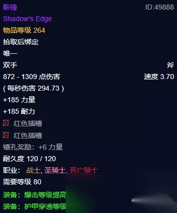 烂肠之血和腐面之血在25人副本中的烂肠和腐面首领掉落。只有拥有任务的玩家才能拾取,且每个首领每次副本只能掉落一个。完成所有需求后,返回大领主达里安·莫格莱尼处交任务。 第一步难度不太高,考验的是财力。 步骤2:暗影之锋 任务起始/结束NPC:位于冰冠堡垒的大领主达里安·莫格莱尼 任务结果:获得影锋 交完圣洁与堕落任务后,达里安会为你锻造暗影之锋。你需要同意他的条件并再次与他对话以获得【影锋】,这是一把橙斧之前的替代品,你将在后续任务中需要使用它。