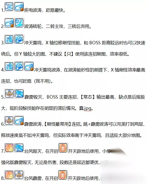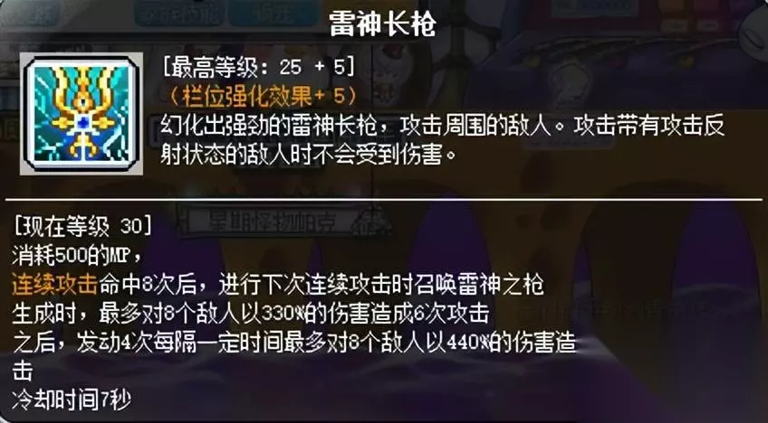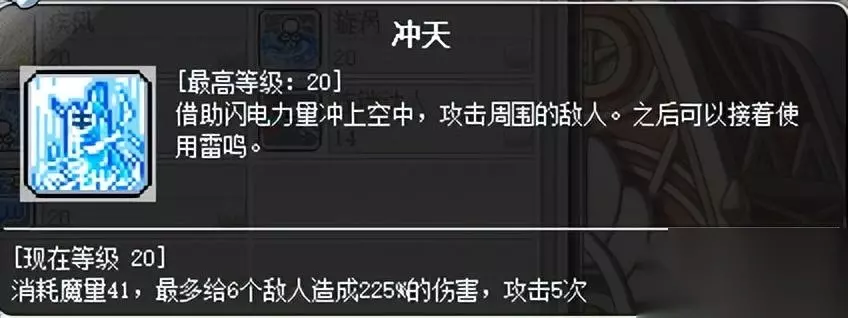 刷怪BOSS核心技能,范围较大,伤害高。超级技能被动可加一段,经聚雷翻倍后12段。打BOSS和毁灭连招,刷怪和波涛连招。很多奇袭刷怪只会无脑冲天雷鸣,实际上奇袭最常用的刷怪连招是跳+霹雳+波涛,可打双层平台,秒怪门槛低。若单独使用,后摇较大。 注意:该技能使用时有跳跃动作,但仅为动画效果,角色实际位置不变。
