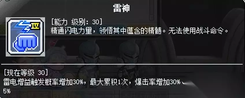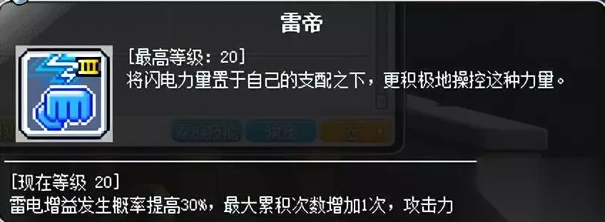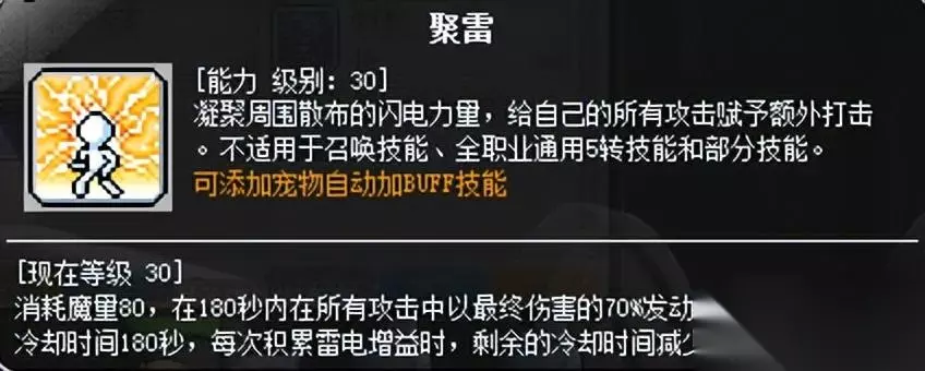 这是5层雷电增益的样子。 雷电增益的作用: 1.每层增加5%无视,5层25%无视,学习超级技能“开天辟地”后,每层增加9%无视,5层45%无视; 2.用台风技能清理雷电增益后,增加伤害百分比,最高35%伤害; 3.为五转V2鲛牙弹提供释放条件; 4.积累时消除核心BUFF聚雷的CD。 总而言之必须打开。