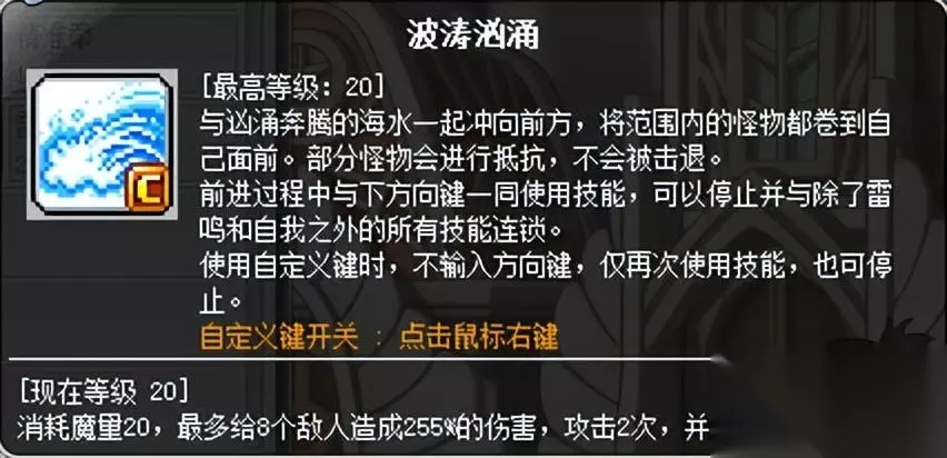 奇袭最重要的位移技能,具备【突进】、【击退】、【急停】、【伤害】四项功能,位移距离适中,不可空中使用。波涛历经多个版本的反复修改,从原先的僵硬变为顺滑,最适合用来收招。 使用技巧:1.连招后接波涛,调整走位;2.右键点击出现C字样时,该技能可通过波涛+下、波涛+波涛两种方式进行急停。右键点击C字样消失时,该技能仅可通过波涛+下方式进行急停;3.使用波涛后按左右任意方向键走动,可达到几乎无后摇的效果;4.与一转疾电连招,赶路飞快;5.可将小怪或道场BOSS推向自己想要的方向。 急停:近年新增,使用急停可缩短波涛位移距离,提高躲避效率。由于波涛本身距离适中,刷怪时可以不开启急停,避免影响效率。但在掉落物较多的BOSS战还是建议开启,可以一定程度上提高角色生存能力。