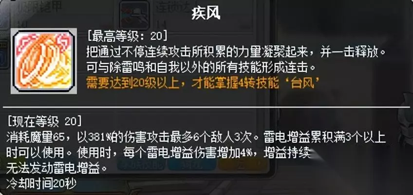 疾风为三转主动技能,台风为四转时疾风的被动强化技能,这里放在一起说。使用时在三转里把“疾风”技能拖到键盘,四转后应用“台风”效果。以下内容均以台风为准。 台风百分比高,延迟低。该技能有几个特点:1.雷电增益在2个以上时可以使用,即