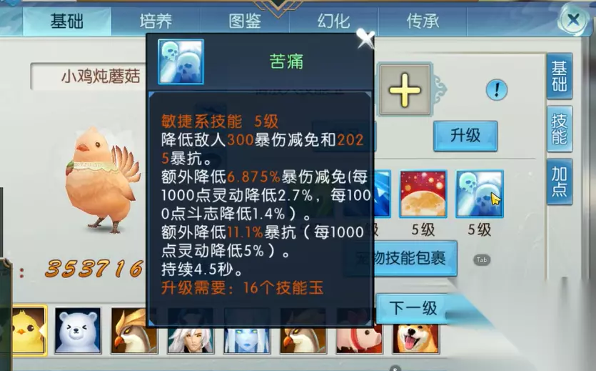 别着急点开技能界面!先花 5 分钟做准备,能帮你省一半资源: 1. 先明确宝宝的 “定位” 不同宝宝适合的技能完全不同,先想清楚你的宝宝是干嘛的: 输出型(比如噬血妖蝠、火烈鸟):核心要堆 “攻击、暴击、攻速”,技能优先选加伤害的; 辅助型(比如灵狐、玉兔):重点帮主人回血、加 buff,技能选治疗、增益类; 坦克型(比如玄龟、石灵):负责扛伤害,技能优先加防御、气血、减伤。 定位错了,再贵的技能也白搭 —— 比如给玄龟上 “高级致命”,纯属浪费! 2. 备好 2 类关键道具 技能书:分 3 档 —— 普通技能书(如 “猛击”“强身”,便宜,用来开格子)、高级技能书(如 “高级蛮力”“高级治疗”,核心输出 / 辅助技能)、超级技能书(如 “超级致命”“超级防护”,需对应高级技能为基础,效果翻倍); 技能锁:俗称 “锁技能”,用了之后能让已有的技能不被新技能 “顶掉”,重点用来保护你最核心的 1-2 个技能(比如输出宝宝的 “高级致命”),别随便用在普通技能上! 3. 检查宝宝的 “底子” 先看宝宝的资质和成长率:如果资质低于 “卓越”、成长率没到 “完美”,建议先洗练再上技能 —— 不然技能再好,底子差也发挥不出效果,纯属浪费资源。
