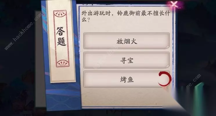 阴阳师7.14仲夏行凉萤火溪流答题答案 问题:外出游玩时,铃鹿御前最不擅长什么? 选项: 1、放烟火 2、寻宝 3、烤鱼 正确答案:烤鱼
