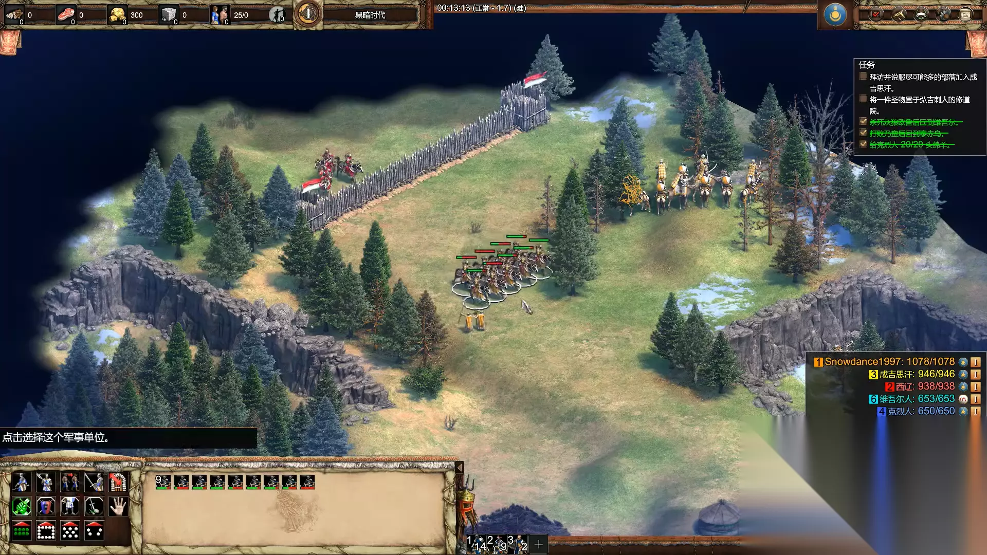 开局先别急着让农民进村子,稍等一会儿西北方向会出现三个枪骑兵和一个轻骑兵。用枪骑兵把两个条顿武士往村子方向引,边跑边打,村子东北角有修道院和两个僧侣能帮忙补血。这关资源紧张,得精打细算,建议优先控制俘虏营获取额外资源。