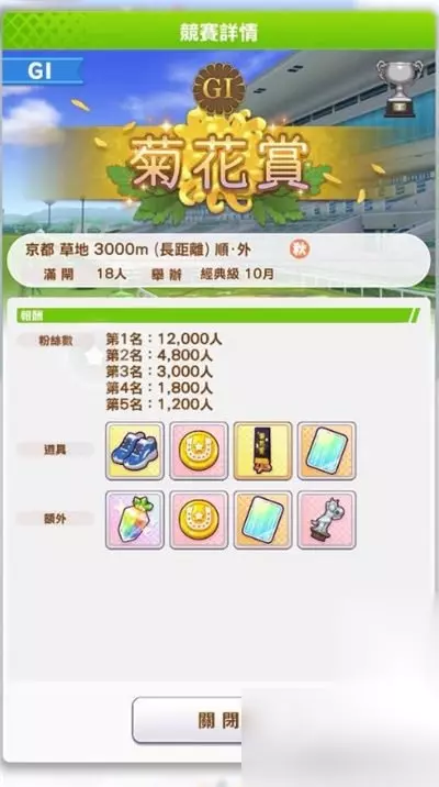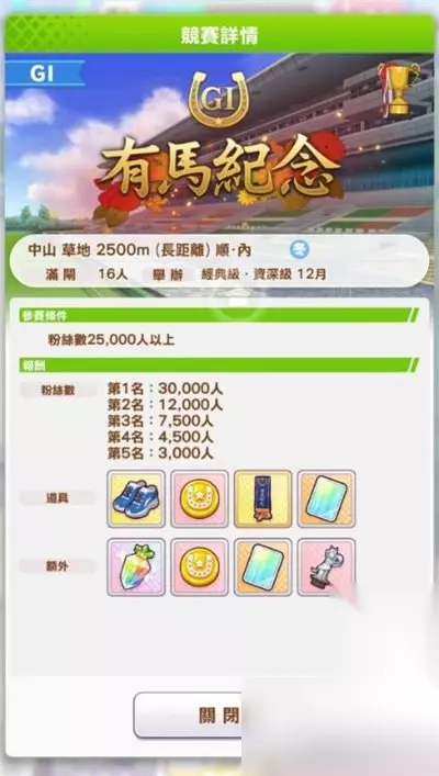 【三后冠】 樱花赏 第2年 4月前半 经典级 阪神 1600m 一哩 顺 外 奥克斯 第2年 5月后半 经典级 东京 2400m 中距离 逆 秋华赏 第2年 10月后半 经典级 京都 2000m 中距离 顺 内 【秋季资深三冠】 天皇赏(秋)第2/3年 10月后半 经典级/资深级 东京 2400m 中距离 逆 日本杯 第3年 11月后半 经典级/资深级 东京 2400m 中距离 逆 有马纪念 第3年 12月后半 经典级/资深级 中山 2500m 长距离 顺 内