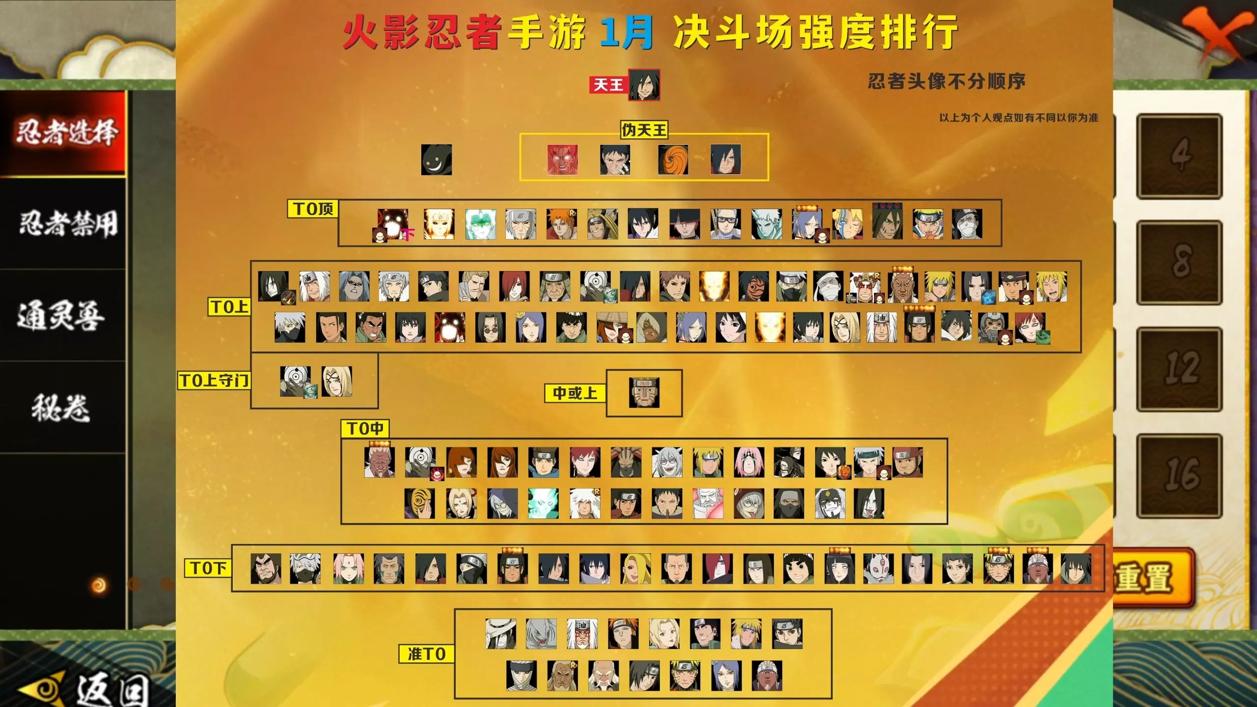 这是一篇动漫杂谈类的忍者实用性排行帖,作者按实用性将忍者分为T0、T0.5、T1、T2四个梯队,分享了各梯队忍者的特点,比如部分T0梯队忍者有高额伤害、攻击力加成等优势,该排行仅为个人观点。
