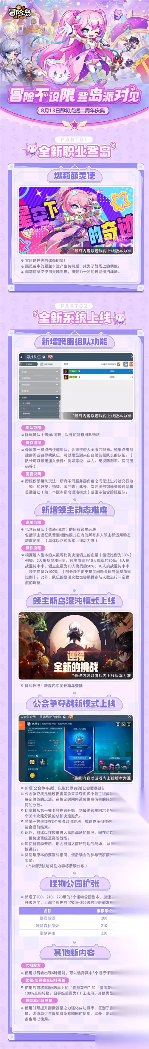 冒险岛枫之传说周年庆版本将在8月13日开启,本次周年庆全新职业爆莉萌灵使登场,另外还有跨服组队、领主动态难度调整等,更新内容非常丰富,下面带来二周年庆版本活动内容爆料,各位来看看吧。 冒险岛枫之传说二周年庆典前瞻