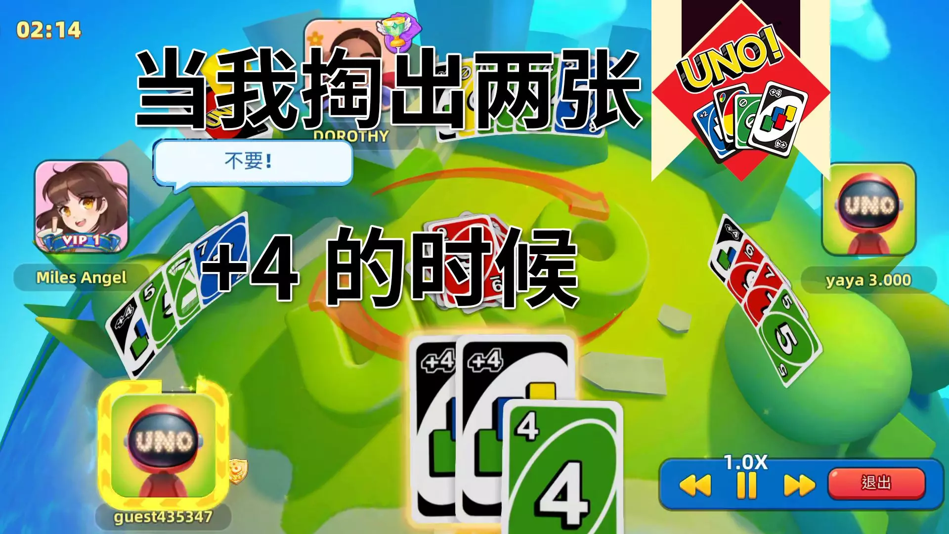 这是一起优诺的搞笑对局内容,展示了四名玩家的UNO牌局对战过程,牌局里的卡牌互动让对手露出疑惑反应,充满趣味,尽显一起优诺的欢乐对战魅力。