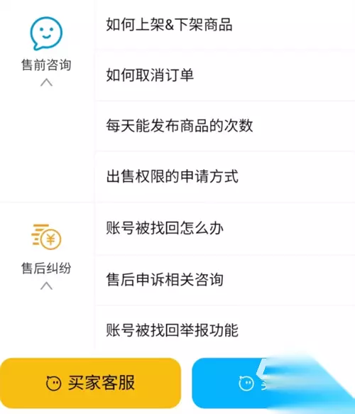 由于平台里面的用户群体很是活跃,且咨询量也是非常的大,所以它把很多问题都进行了统一的归纳整理,主要分为售前和售后两类,玩家可以在这里查找到自己想要的答案,如果确实需要人工来帮助自己的话,那么通过卖家通道进入即可,不仅能减少排队等待的时间,也能得到更加专业的回答。