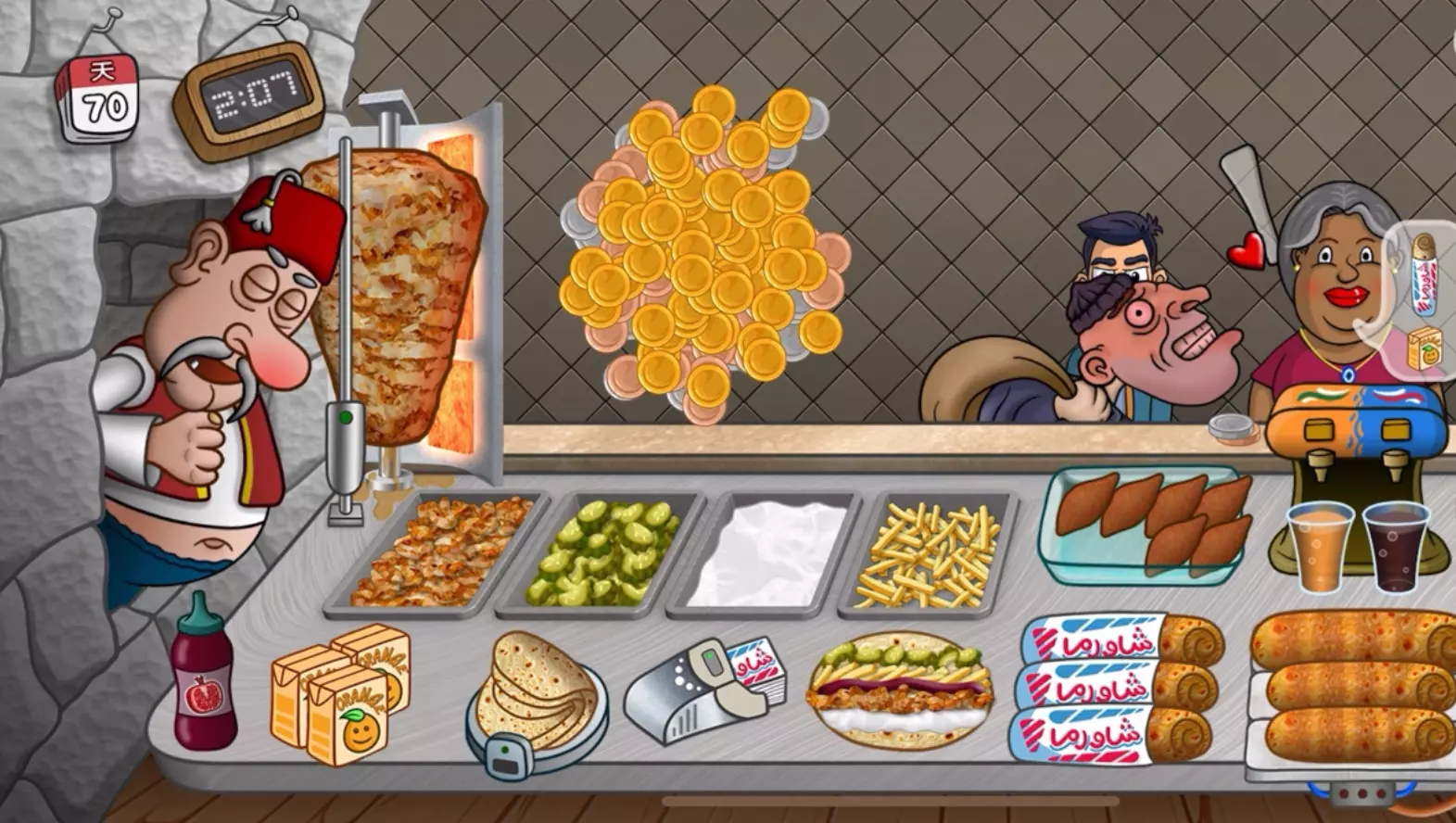 这是一款沙威玛制作经营游戏,玩家在游戏里经营沙威玛小店,制作沙威玛餐品、搭配小食与饮品来满足顾客需求,还能查看店铺经营进度,体验趣味的小店经营过程。