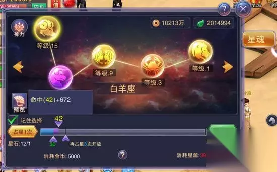 坐骑有独立于人物角色的坐骑等级。坐骑等级的提升可以直接提升坐骑的属性,从而提高人物的战斗力。坐骑的进阶需要使用坐骑进阶石,每一次使用一定数量的进阶石,有几率让自己的坐骑进阶到下一阶段。坐骑进阶可以激活新的坐骑形象,同时大幅提升坐骑属性。 玩家在获得了多种坐骑形象之后可以自由选择幻化,幻化之后坐骑的属性和移动速度都会保持当前最高阶的属性不变。 坐骑形象主要可以通过坐骑进阶和坐骑幻化卡来获得。 修行系统 随玩家等级提升可以激活相应的星魂星脉,使用星源可以提升星脉等级,增加属性加成;使用星石可以刷新星脉属性和数值。