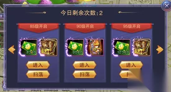 坐骑副本 玩家达到30级之后会开启坐骑副本,每天有两次进入坐骑副本的机会。 坐骑副本分等级开启;玩家角色等级越高,可以挑战越高级的坐骑副本,从而获得更高级的坐骑道具作为奖励。每天有两次机会选择对应难度挑战副本。 在副本中击败小怪可以获得人物经验,坐骑道具,以及额外的坐骑经验。 副本试炼 天尊副本 天尊等级0级以上可开启对应的天尊副本;开启新的天尊副本后,上一个天尊副本的奖励自动并入新的副本,无需重复刷本;越高级的天尊副本,奖励越丰厚;单个天尊副本每天只能进入一次。 猎魔试炼 玩家达到一定等级之后会开启猎魔试炼。通关试炼可以获得属性奖励和称号奖励;完成试炼场挑战目标可以获得珍稀物品奖励;试炼场挑战不限制次数,已经挑战过的首领也可以重复挑战。