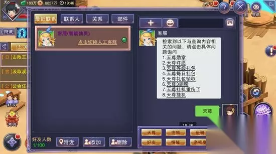 好友系统 打开好友面板,客服会在最近联系中出现。玩家在游戏中有疑问均可找客服询问解决。 玩家在游戏中可通过添加好友的方式与其他玩家进行互动,只要人物等级≥1级,即可添加好友;添加好友的上限为100人。