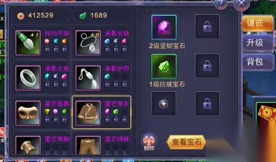 元力可以增加人物属性,带来战力的提升;元力等级不能超过人物等级;元力提升依靠元能,元能可以在勇士历练玩法中获得。 宝石系统 不同装备可以镶嵌不同类型的宝石,一个部位只能镶嵌一颗同类型的宝石,一共可以镶嵌6颗宝石;镶嵌宝石可以获得装备属性加成;宝石刻印可以增加属性,使用宝石刻印晶可以提升刻印等级。