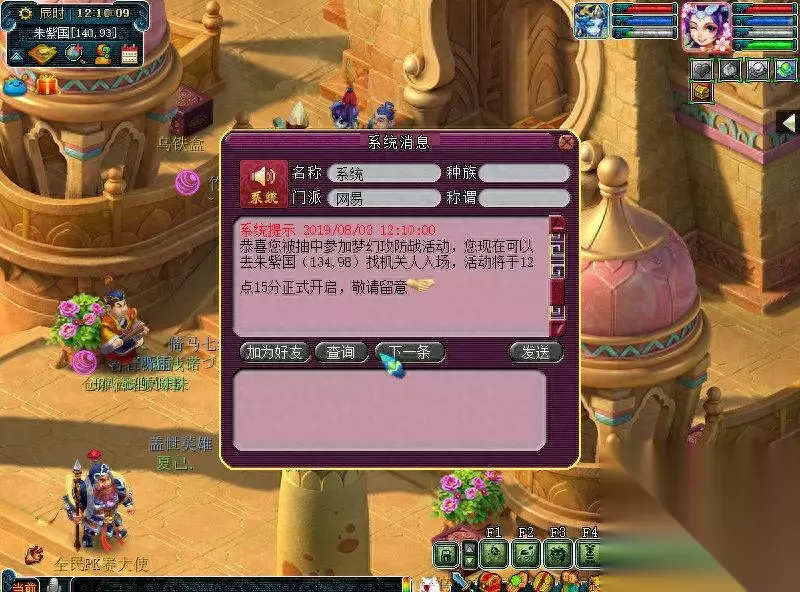 报名成功的话就会出现系统消息,12:10分发放资格以及红蓝阵营名单。收到这个你就可以屁颠屁颠进场了。 3、进去之后,有两个要点:第一,左上角显示你是哪个阵营的,得记住哈;第二,点那个机关鸟,然后自荐指挥官。