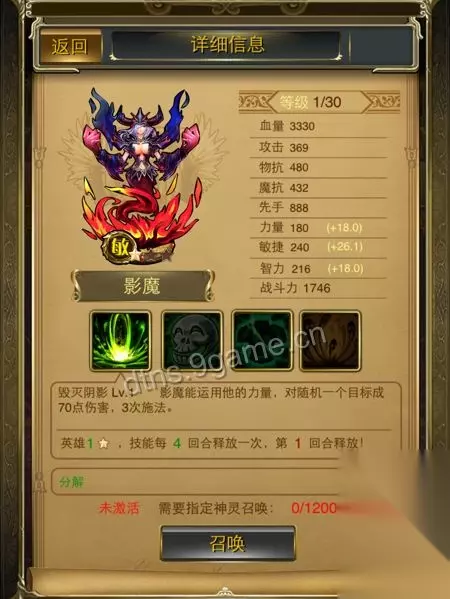影魔强大的输出背后,比较血薄脆皮是他的缺点。超高的普攻以及物抗都足以让他站在团队3、4号位,屹立不倒。 有关于影魔的技能: 毁灭阴影(16级):三次施法(随机对3个目标施法,算群攻吧),随机目标790伤害,4回合释放一次,第一回合释放。有胜于无。 支配死灵(16级):增加210点攻击力(属于变态型被动技能)。 魔王降临(16级):减少对面前两排单位350点护甲(群体减防,可以堪比大鱼人点灯技能了)。 魂之挽歌(10级):对前两排造成5060点伤害,并降低先手值20%和攻击力15%持续1回合,每11回合释放一次,第2回合释放(强力大招,最高爆发点)。 我只能说,为了影魔的大招,我愿意将他从“小”培养起来。基础攻击还可以,物抗魔抗相当好,就是血量有点少。在很多时候,影魔摇一个大招下去,再配合冰女的大招以及飞机的技能,基本上前排就被扫干净了。所以我定位影魔是标准的主力输出,稳坐敏捷型领军人物。