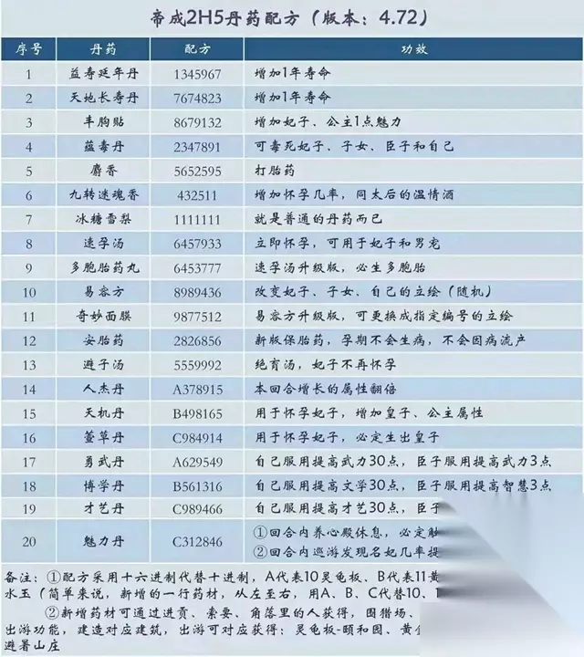 1、益寿延年丹 配方:1345967 功效:增加1年寿命 2、天地长寿丹 配方:7674823 功效:增加1年寿命 3、丰胸贴 配方:8679132 功效:增加妃子、公主1点魅力 4、蕴毒丹 配方:2347891 功效:可毒死妃子、子女、臣子和自己 5、麝香 配方:5652595 功效:打胎药 6、九转迷魂香 配方:432511 功效:增加怀孕几率,同太后的温情酒 7、冰糖雪梨 配方:1111111 功效:就是普通的丹药而已 8、速孕汤 配方:6457933 功效:立即怀孕,可用于妃子和男宠 9、多胞胎药丸 配方:6453777 功效:速孕汤升级版,必生多胞胎 10、易容方 配方:8989436 功效:改变妃子、子女、自己的立绘(随机) 11、奇妙面膜 配方:9877512 功效:易容方升级版,可更换成指定编号的立绘 12、安胎药 配方:2826856 功效:新版保胎药,孕期不会生病,不会因病流产 13、避子汤 配方:5559992 功效:绝育汤,妃子不再怀孕 14、人杰丹 配方:A378915 功效:本回合增长的属性翻倍 15、天机丹 配方:B498165 功效:用于怀孕妃子,增加皇子、公主属性 16、萱草丹 配方:C984914 功效:用于怀孕妃子,必定生出皇子 17、勇武丹 配方:A629549 功效:自己服用提高武力30点,臣子服用提高武力3点 18、博学丹 配方:B561316 功效:自己服用提高文学30点,臣子服用提高智慧3点 19、才艺丹 配方:C989466 功效:自己服用提高才艺30点,臣子服用提高魅力3点 20、魅力丹 配方:C312846 功效: ①回合内养心殿休息,必定触发宫女爬床 ②回合内巡游发现名妃几率提高 相关文章推荐>>皇帝成长计划2菜谱配方汇总