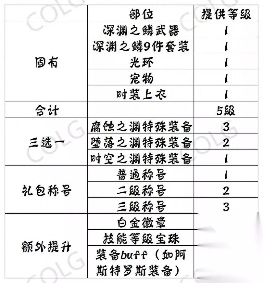 3.换装堆砌方式 换装搭配为深渊之鳞9件套(防具5+首饰3+武器1)+特殊装备套装3选1,完美换装选用时空之渊特殊装备,奶系职业无需做buff换装。各位小伙伴要注意了,完美换装为在自身等级基础上增加10级buff,而非全职业统一,不同职业初始等级不同,切勿认为和大多数一样都是20级。