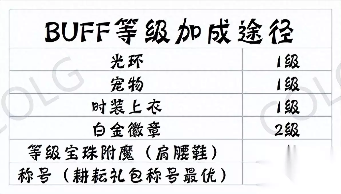 由上图可知,buff换装要达成完美配置(选用时空之渊特殊装备),我们基础等级为5级,选用时空之渊装备再增加1级,这时我们就需要再堆4级才可以满级,这时如果选用白金徽章技能宝珠等就消费较大,这时我们选用耕耘礼包的3级称号较为节约,如果宝珠白金等有多余时,也可以选择二级称号等更为便宜的方法,具体各种堆法见下图: 注:当前版本由于有希曼buff及精灵活动buff等影响,各位小伙伴一定要根据下表以实际等级为准,切勿被换装栏等级欺骗。