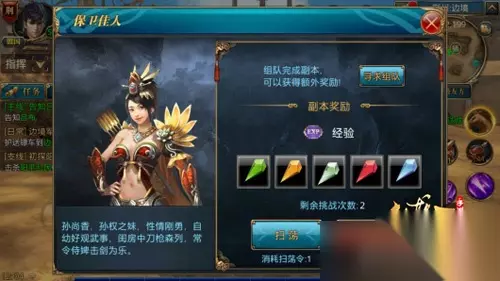这是小编今天给大家整理出来的全部内容,给大家带来御龙在天相关的资讯,最后希望这篇文章可以帮助大家,感兴趣的小伙伴们不要错过了哦!本文共计1177个文字,预计阅读时间需要2分56秒。 保卫佳人副本在40级开启,每天可以完成两次,每次消耗30点体力,进入副本后需要保卫佳人孙尚香不被各种大色狼杀死,击杀所有的大色狼即可完成副本,获得副本奖励。副本的固定奖励是2万经验和2个一等宝石礼包,一等宝石礼包打开后可随机获得一个一等宝石。 保卫佳人扫荡副本