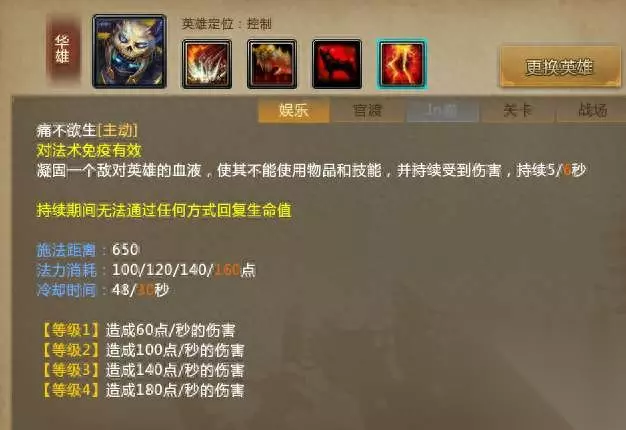单纯从技能的效果来看,华雄的每一个技能都是非常恐怖的,但是仔细一对比就发现,它的大招在游戏中显得过于强大,所以必须要以这个技能为核心考虑华雄的打法。华雄的大招痛不欲生可以造成一个英雄的禁咒和持续伤害,禁咒在梦三国2中是一个非常恐怖的效果。不仅无法使用技能,而且连道具也无法使用,被动技能也会被因此禁锢。