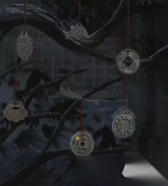 21、回到庭院,点击树上挂的钱币,调换成如图的顺序获得发条钥匙。