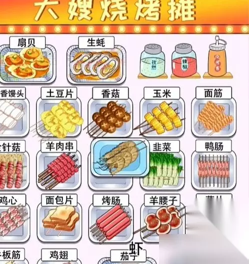 大嫂烧烤摊通关攻略 1、可以根据烧烤的样子判断放在哪个位置。 2、玩家需要拖动烧烤将它放到正确的位置上。 3、三个瓶子装的调料是放在游戏画面右上角的位置。 4、其他烧烤摆放位置如图所示,全部摆放正确就可以了。