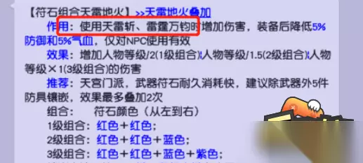 天宫符石组合:“天雷地火” 镶嵌位置:除武器外的所有装备(最多叠加两次) 符石颜色(4孔):红红蓝紫 双四孔效果:降低自身10%血防,增加人物等级*2的伤害 适用技能:天雷斩/雷霆万钧 天宫门派特色: 具有15%的几率避免受到负面法术影响。当有其它同类效果并存时,几率可叠加,但最终的抵抗几率不超过25%。