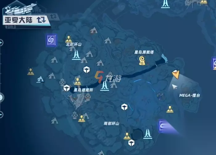 在南部环山那一侧,可以看到星岛地图中心的能源塔和最右下方的能源塔,这两塔之间连线的中心就是第三处风景点。 第四处风景点在星岛最下方的那个传送点旁边(南部环山)。 第五处风景点在星岛最右侧的传送点正上方(MEGA-擂台附近)。