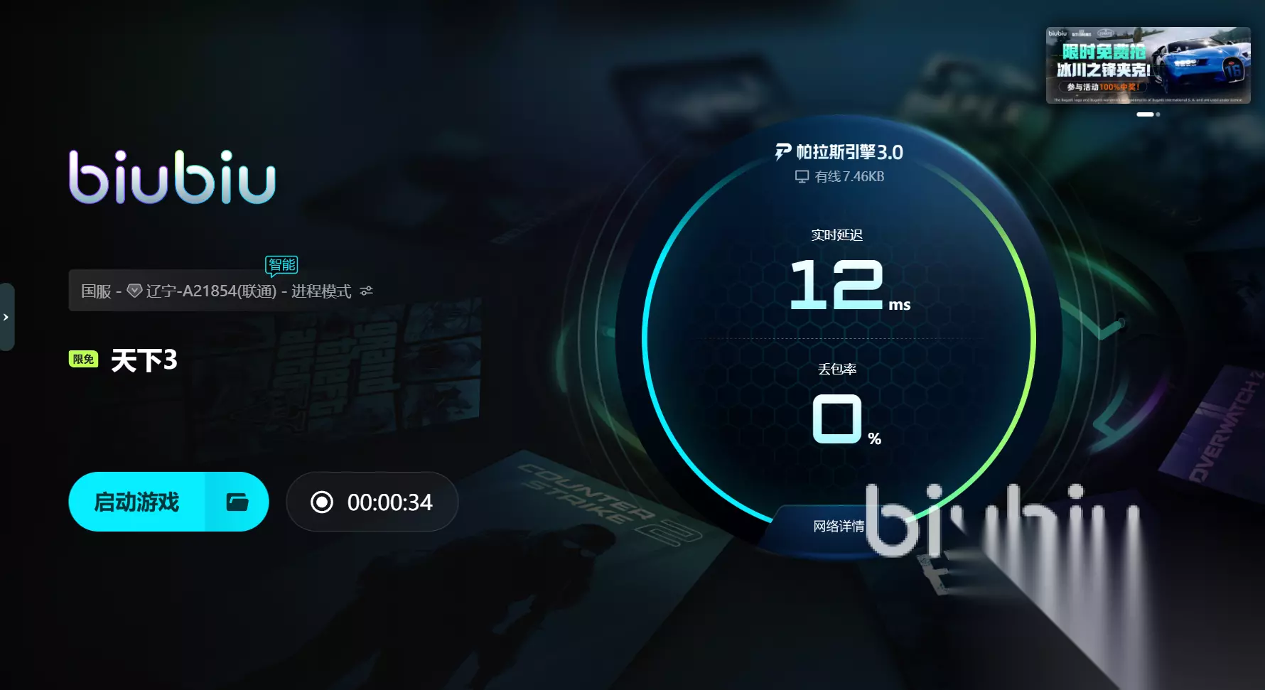 在操作体验上,biubiu加速器保持了一贯的简洁风格:打开客户端后,输入“天下3”即可快速找到对应的加速入口,一键启动即可,无需复杂配置。后台占用资源极低,不影响玩家同时使用语音、直播或录屏。