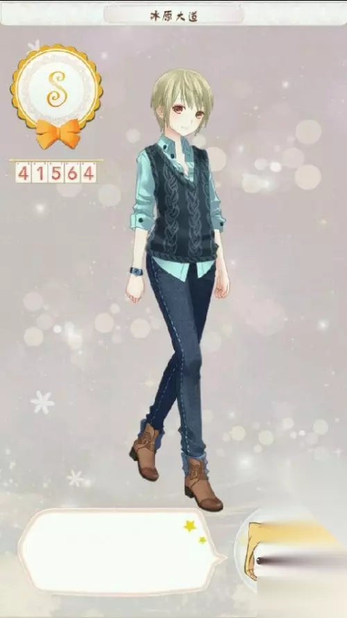 发型:小王子 外套:毛背心/继承者黑 上衣:男装衬衣 下装:直筒牛仔裤 袜子:高腰袜 鞋子:麂皮小靴 手饰:暖暖的手表