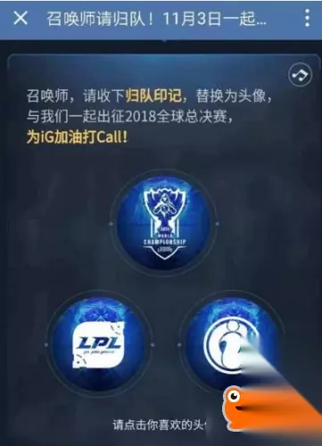S8决赛最终战役即将打响,通过一个H5点亮你的归队档案,测一下你与哪位职业选手最像,换上2018全球总决赛LPL专属头像,转发传递召唤师归队,和iG电子竞技俱乐部一起出征,为他们加油打call,告诉全世界我们是LPL!