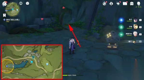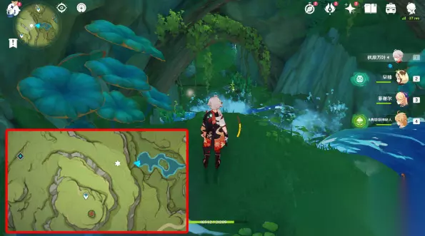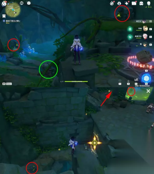 2、然后进入洞窟,激活四个草元素方碑,解锁机关,启动机关,水位完全退去,四个草元素方碑位置: 第一、二个:在石头里(红圈),用草元素攻击下方的石头(绿圈),就看到草种子了 第三个:在角落里 第四个:在屏障后面,从旁边可以进去,不需要破除屏障
