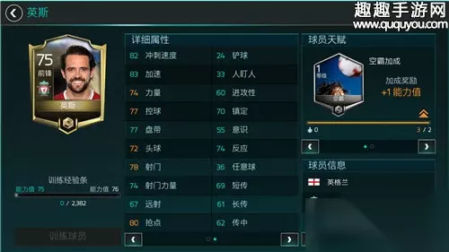 如果不是伤病的话,英斯本可以在利物浦大放异彩的。今年伤愈复出转会南安普顿的他在场上的表现相当不错。作为一名身高只有178的矮前锋,拥有空霸属性的他力量和头球本来就非常没有优势,到了后期天赋加成对他影响最大的可能只有抢点,射门以及控球这三项了。 总结: 同一种天赋作用在不同类型的球员身上,在赛场上体现出来的效果也有所不同,因此各位选择球员之前还要结合天赋再斟酌一下。
