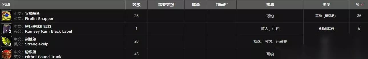包含:火鳞鳝鱼、黑标美味朗姆酒、荆棘藻、秘银箱