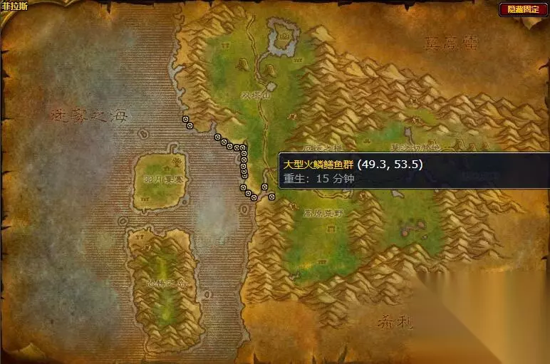大型火鳞鳝鱼群中的火鳞鳝鱼可做成火焰之油,那么大型火鳞鳝鱼群在哪分布呢,玩家可以在菲拉斯、塔纳利斯、艾萨拉三个地方找到,菲拉斯的鱼群分布最多,以下就是详细的大型火鳞鳝鱼群位置介绍。 魔兽世界大型火鳞鳝鱼群在哪 答:菲拉斯、塔纳利斯、艾萨拉 位置介绍: 1、大型火鳞鳝鱼群可在:菲拉斯、塔纳利斯、艾萨拉三个地方找到; 2、【菲拉斯】是该鱼群分布最多的地方,且多分布在西边的沿海处;