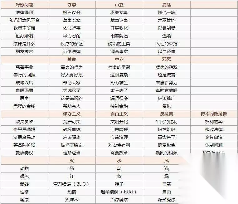 如何才能“成为他的菜”那就要从NPC属性说起了~ 好感度问答策略 游戏中的每个角色都有属性,除了代表自然力量外“风.火.水.大地”除了属性,还有“守序”.“中立”.“混乱”.“善良”.“中立”.“邪恶”这些属性可以区分他们的性格,以及“保守主义”.“自由主义”.“反抗者”.“邪恶者”四种主义解释了他们的政治观点。我们要做的就是从他们的属性中找出最能戳中他们内心的选择。 在阿伦的人物介绍页面上,标明了代表他人物的三个属性,“混乱善良”.“水属性”和“自由主义”。 因为善良,如果艾伦问你对慈善的看法,你应该告诉他“这是一种善良的行为”如果你告诉他“这是社会的平衡”或者“虚伪的游戏”,他会觉得心里有箭!