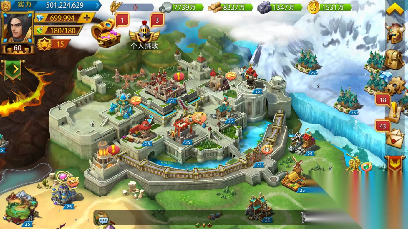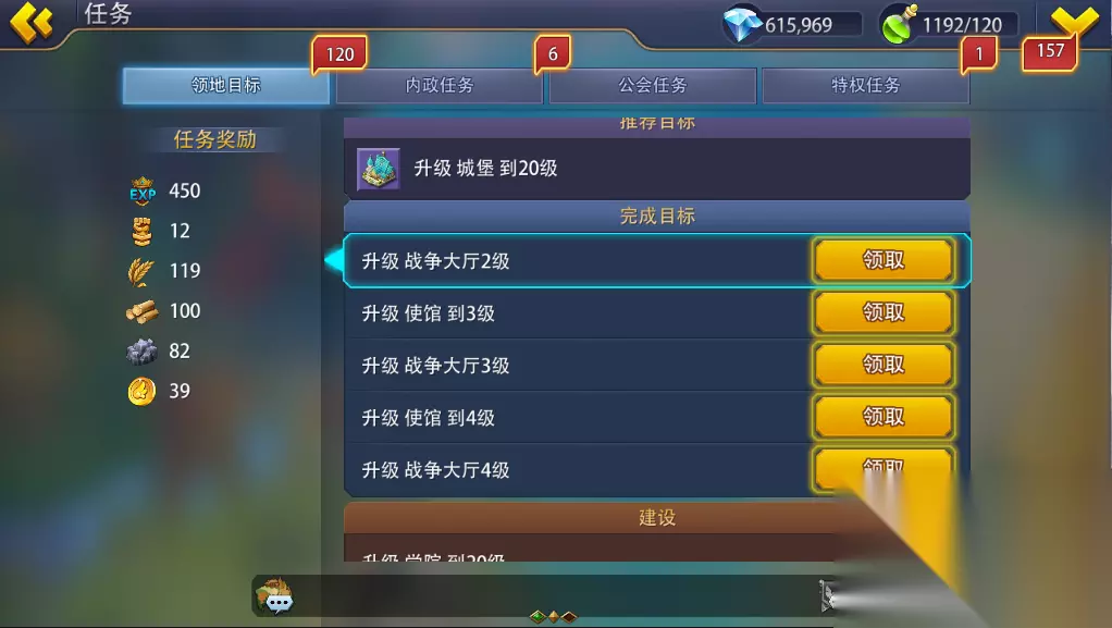 英雄之冠《英雄之冠》任务系统介绍如下: 任务分为领地目标、内政目标、公会任务、特权任务四种类型。可通过主界面右侧菜单进入任务界面。任务系统提供玩家当前可完成的短期目标,如升级建筑、训练士兵、通关冒险、采集资源等。完成任务后可获得基本道具如:木材、石头、粮食、铁矿、领主经验、领主实力等。 玩家在游戏中可以接到领地任务,领地任务分为军事、研发、挑战、成长、其他五大类型,每个类型分别展示玩家当前最易完成的5个任务。已经完成的目标显示在完成目标中,最多显示五个,点击领取可领取该任务奖励。部分主要的任务会显示为推荐目标且在主界面进行显示,可点击前往直接进入该任务需要操作的界面。