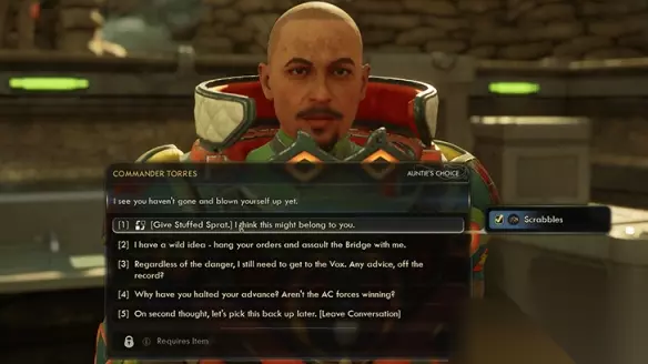 第二步:将斯普拉特归还给托雷斯指挥官 一旦拿到斯普拉特,原路返回找托雷斯指挥官。把玩具交给他,他就会奖励你一系列物品