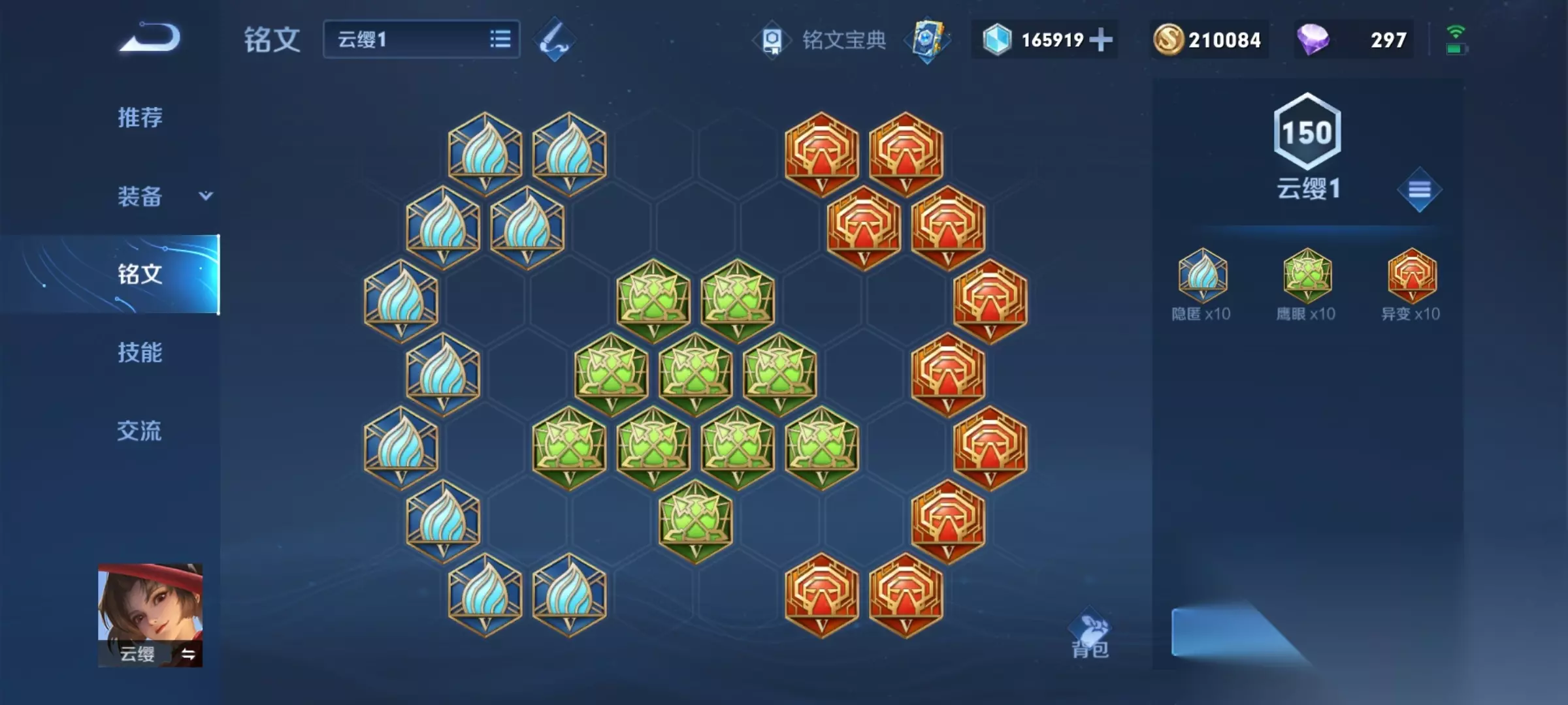 铭文:10隐匿,10鹰眼,10异变 前期主要以减CD为主,前期云缨的CD非常长,减CD可以让云缨发育更快,云缨比较吃强化普攻,而且强化普攻不能暴击,所以不考虑宗师,出冰脉加强黏人能力,末世搭配一段枪意打伤害。 需要注意的点: 很多人老是喜欢攒三段其实没有意义,三段作用并不明显,而且多用于追击斩杀。如果对面血量健康你三段就是刮痧。