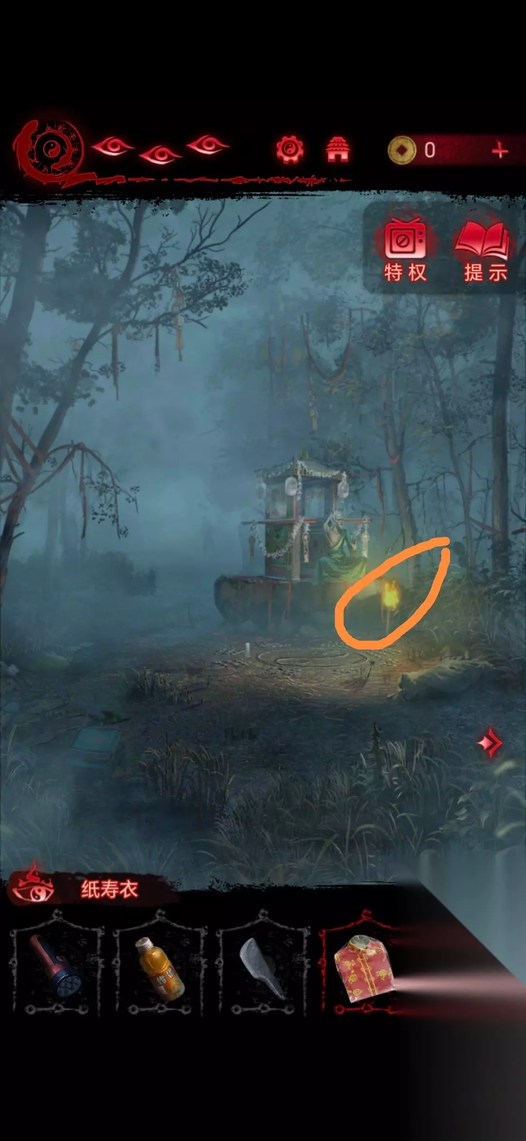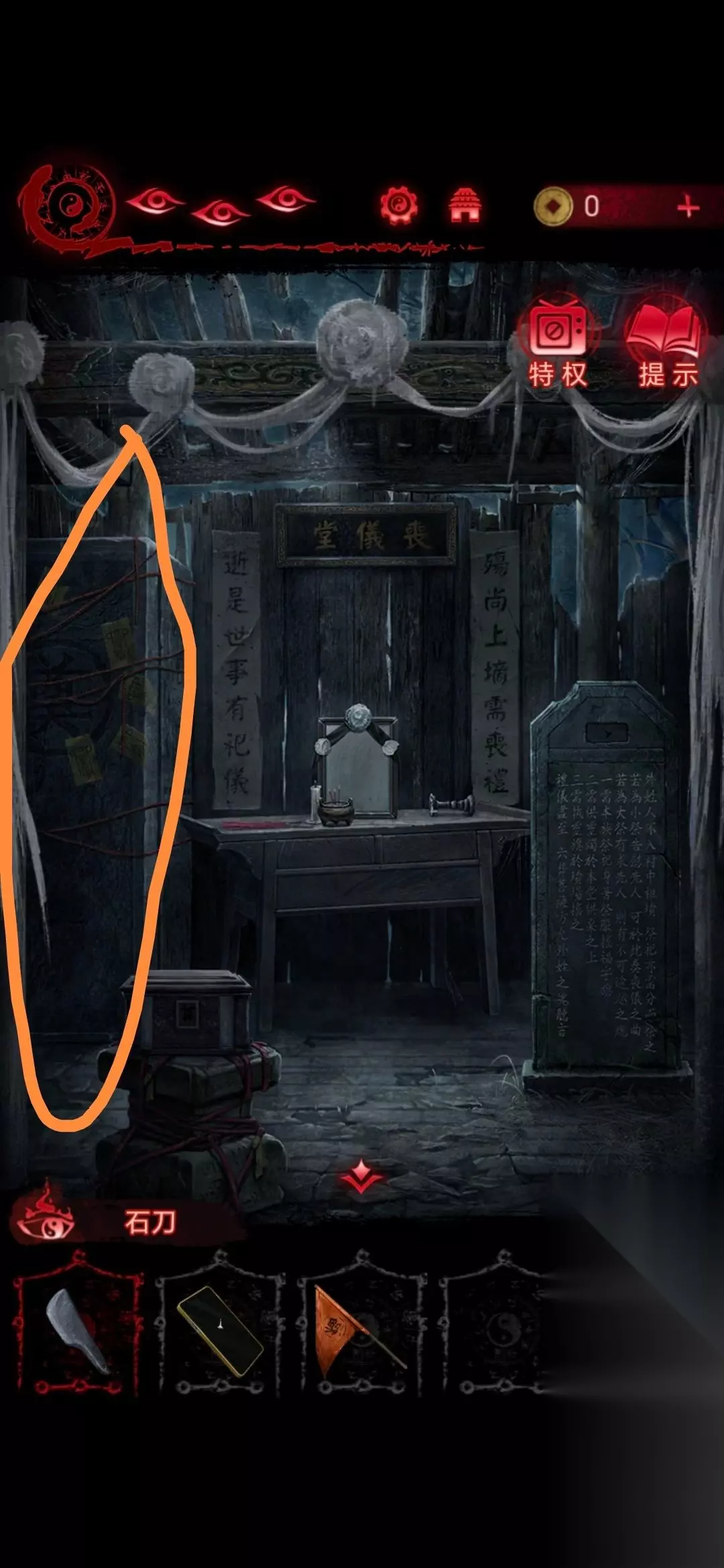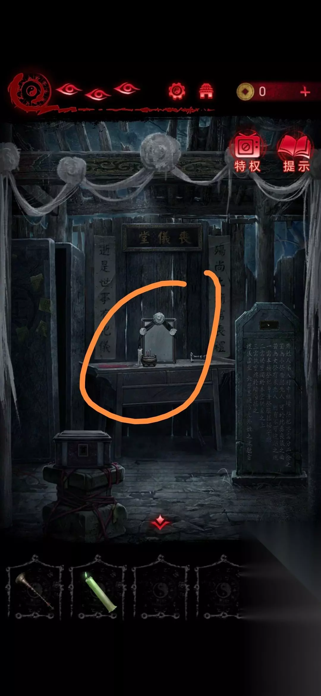 24、将白蜡烛摆放在房间照片前,点击房间左下角的盒子,做小游戏(这个游戏玩法就是遗像脸朝哪边就点哪边,几根香就点第几个字),做完可以获得灵旗;