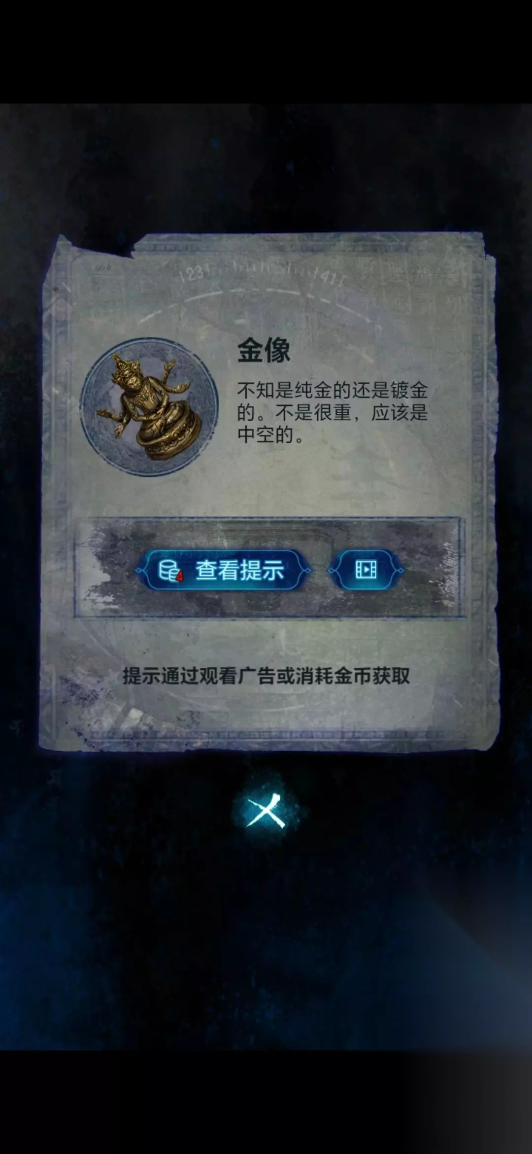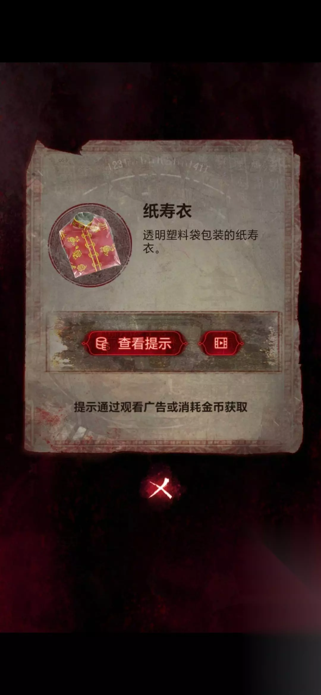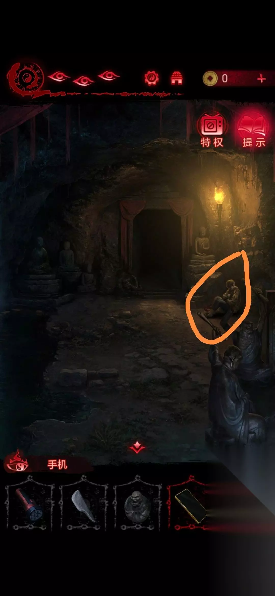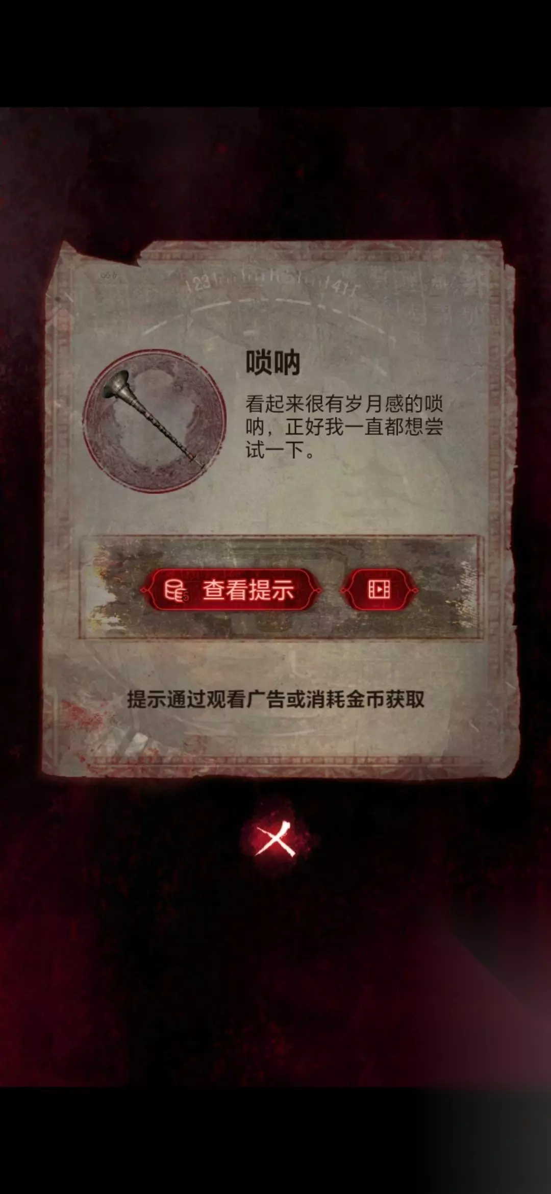 22、然后将手机嵌在房间右侧石碑的凹槽上,用唢呐点击手机,需要做小游戏(不想做看广告跳过),等做完房间左侧石棺获得纸衣服;