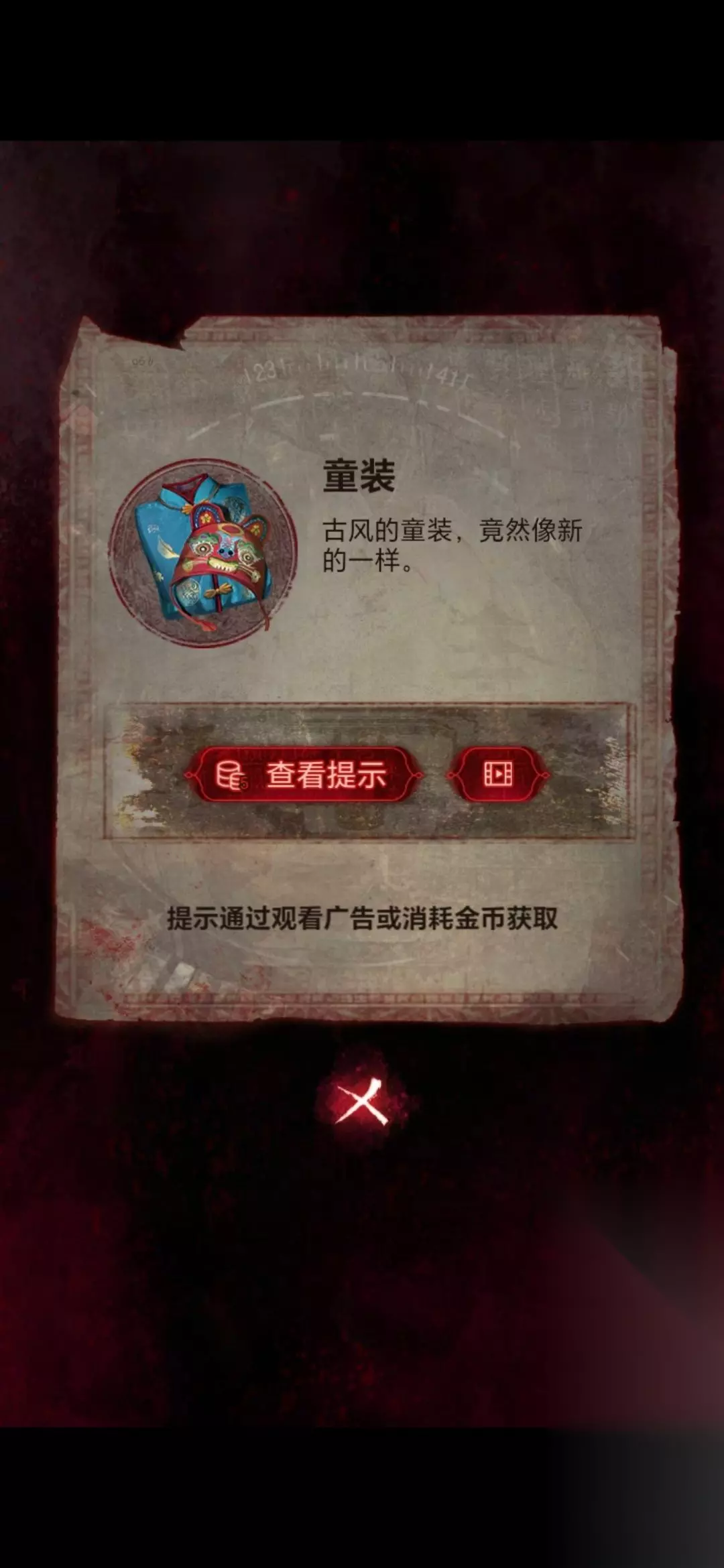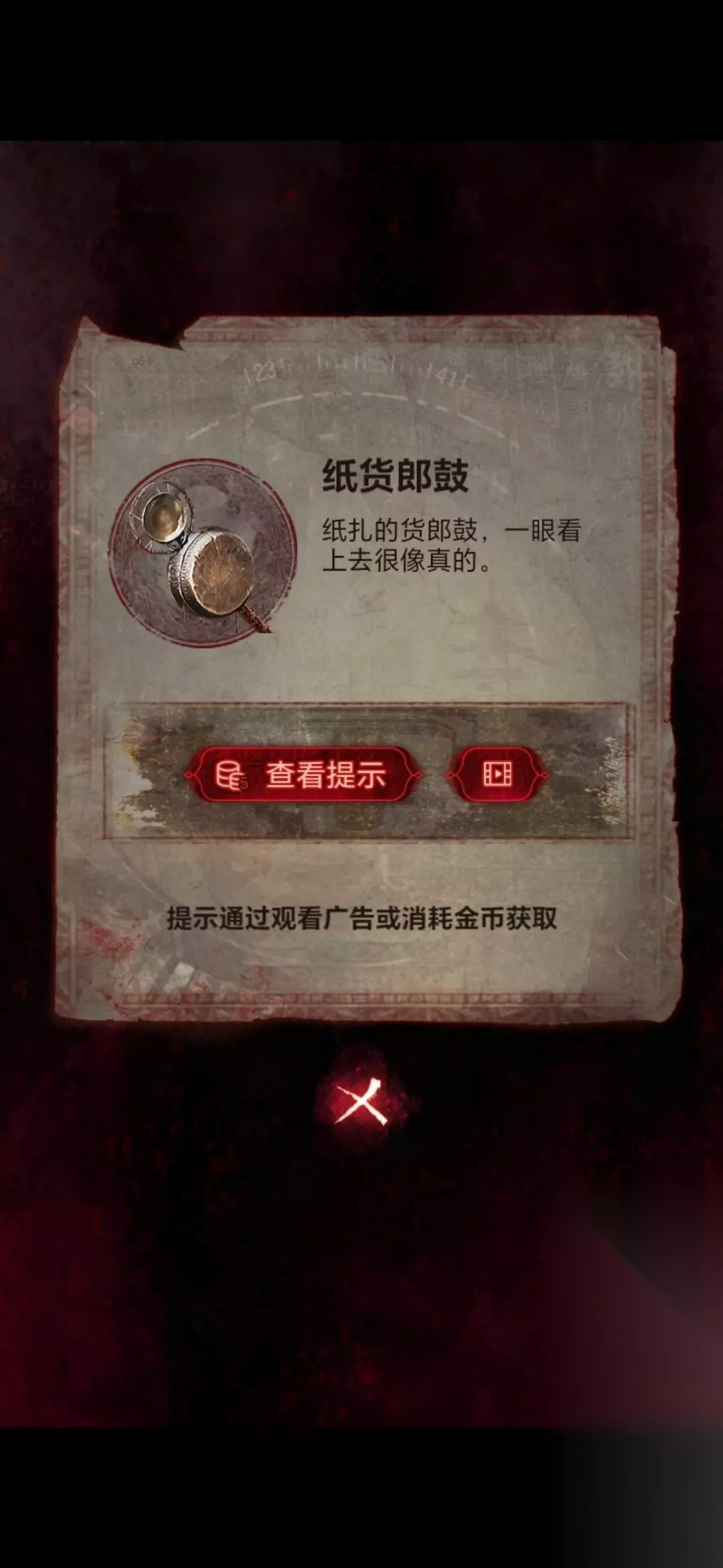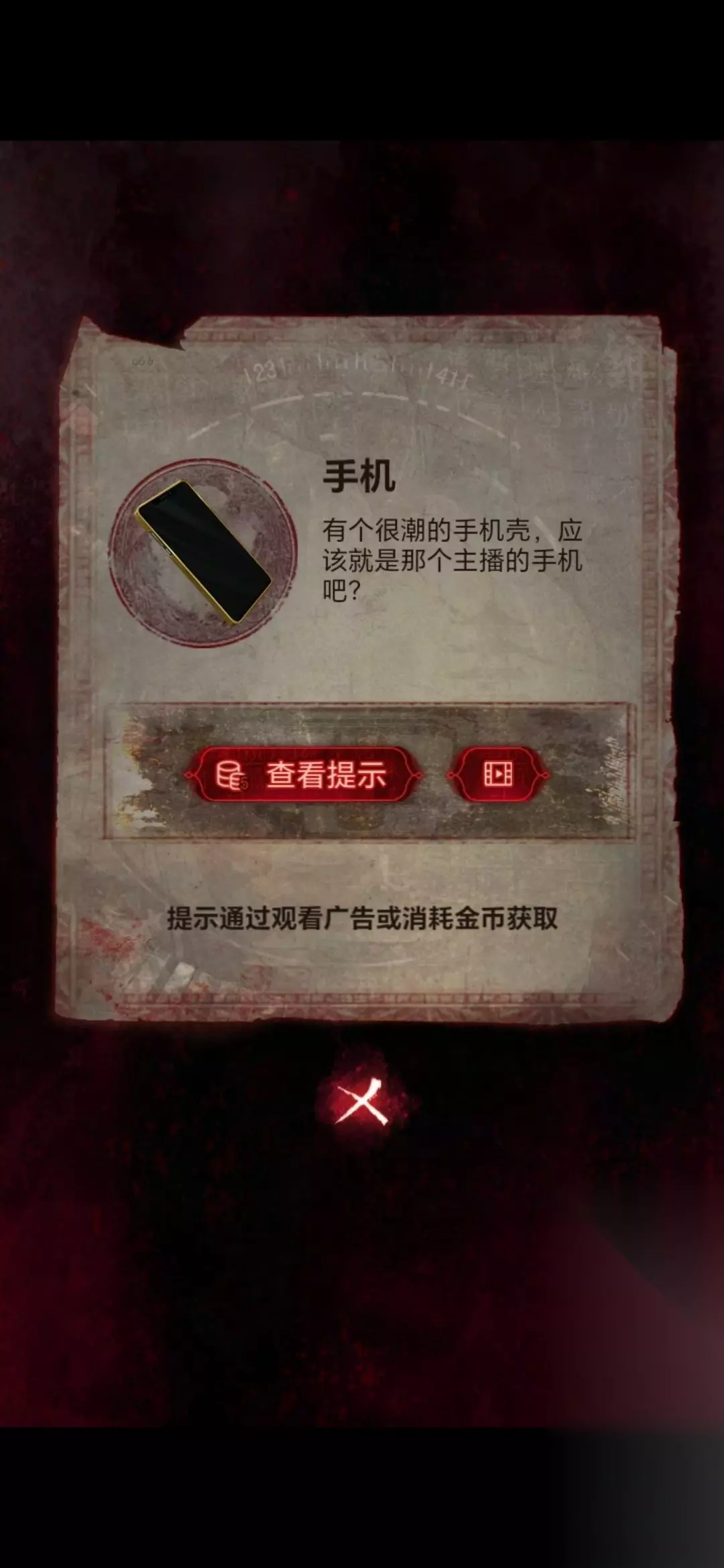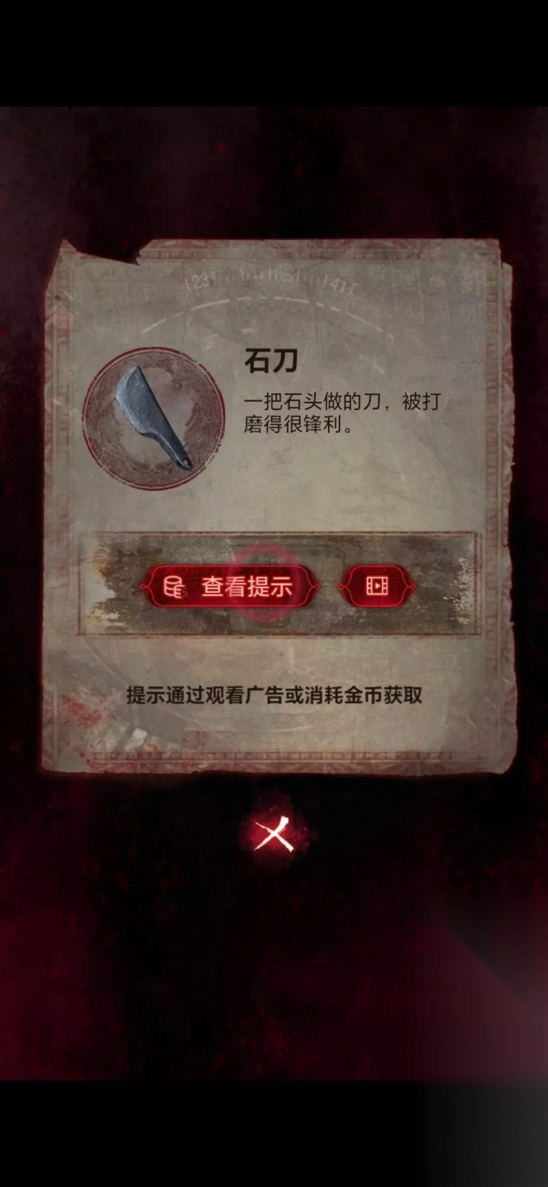 22、然后将手机嵌在房间右侧石碑的凹槽上,用唢呐点击手机,需要做小游戏(不想做看广告跳过),等做完房间左侧石棺获得纸衣服;