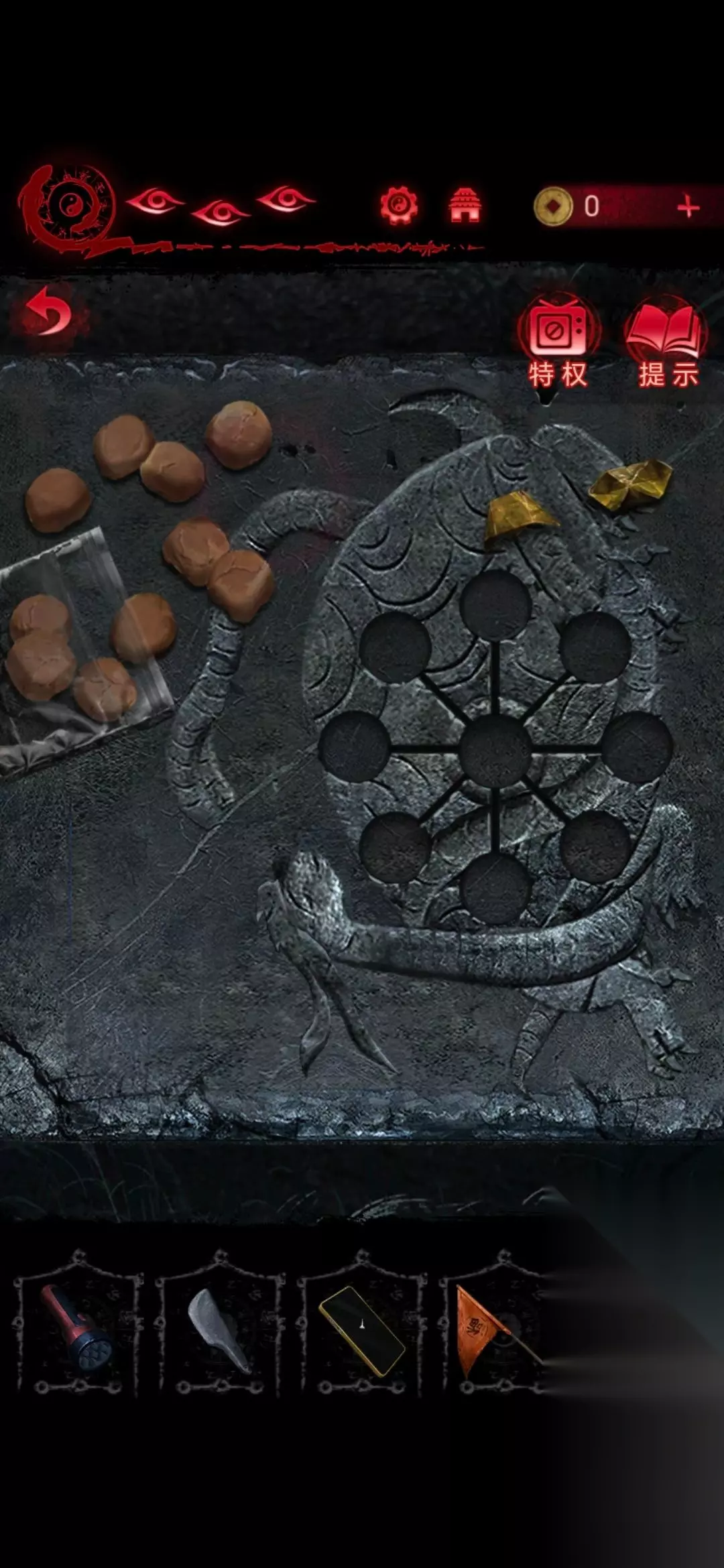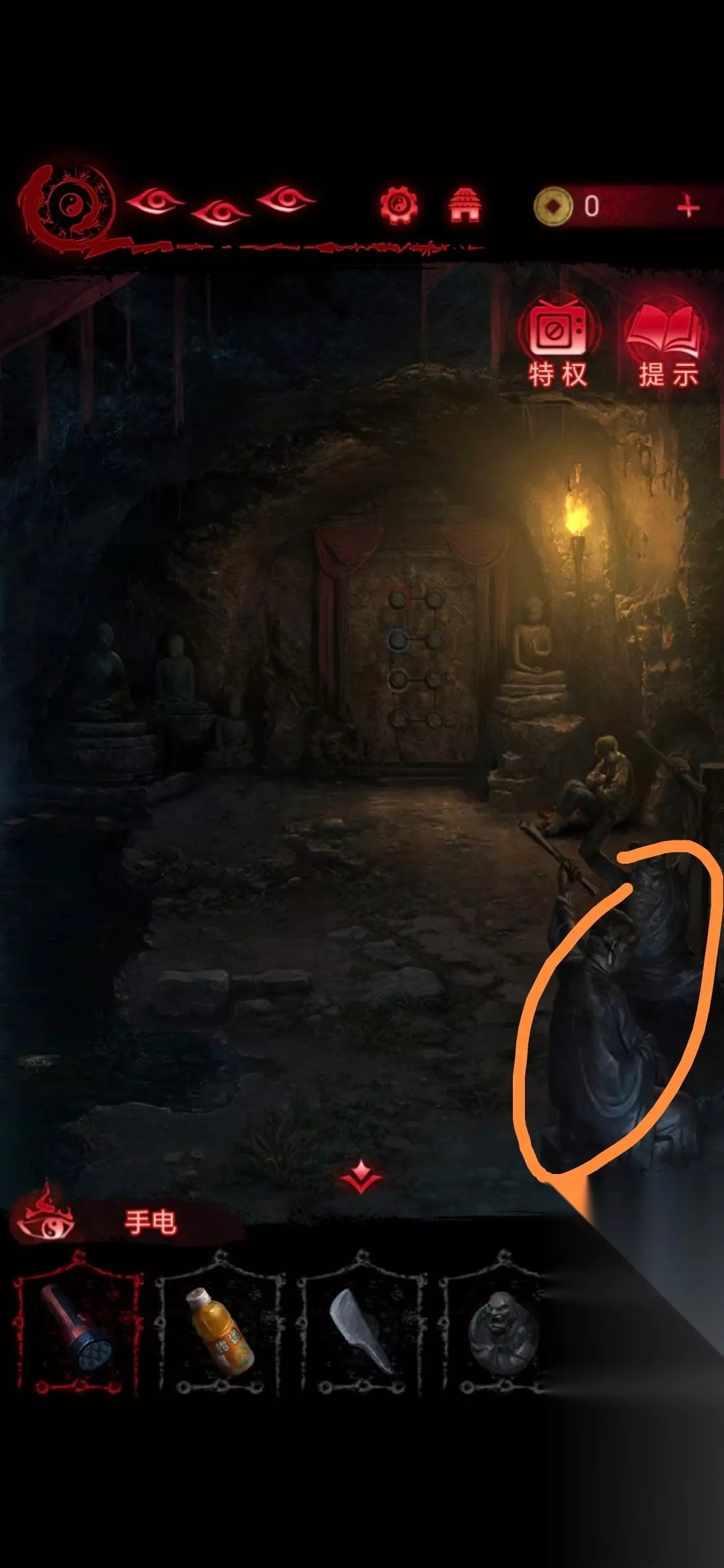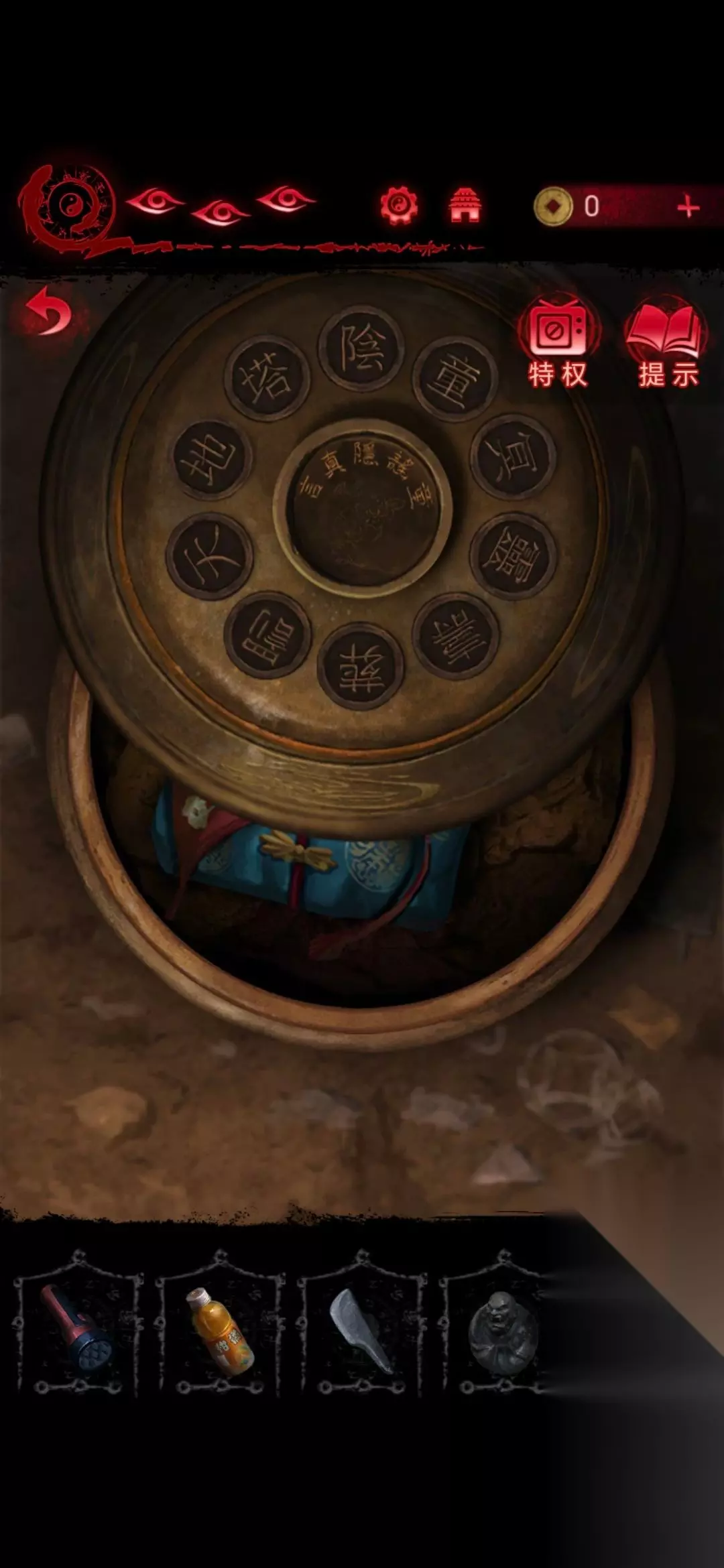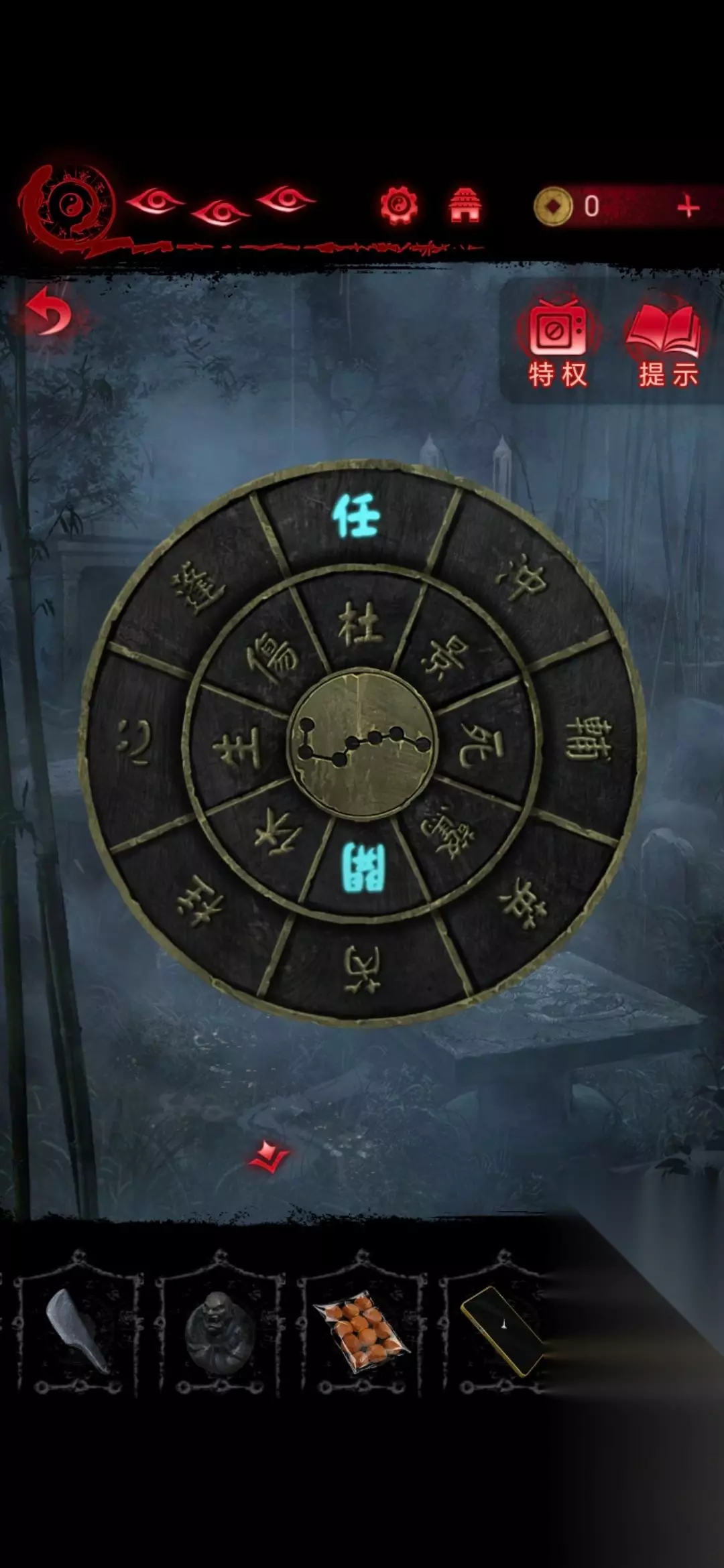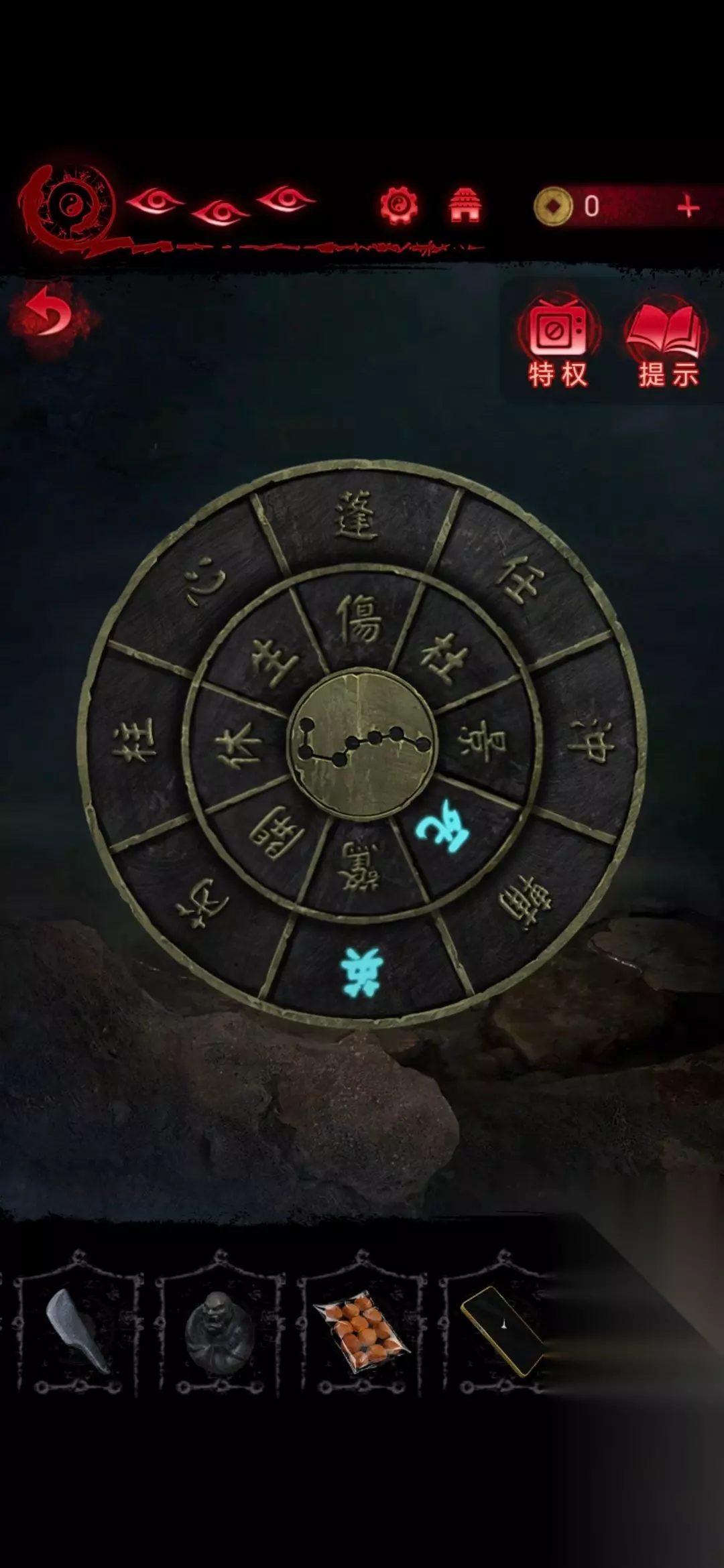 7、然后点击右下石像,从左到右按照231144的顺序击打辟谷,击一个字就亮,当所有字体亮起时,辟谷爆炸得到禅杖;