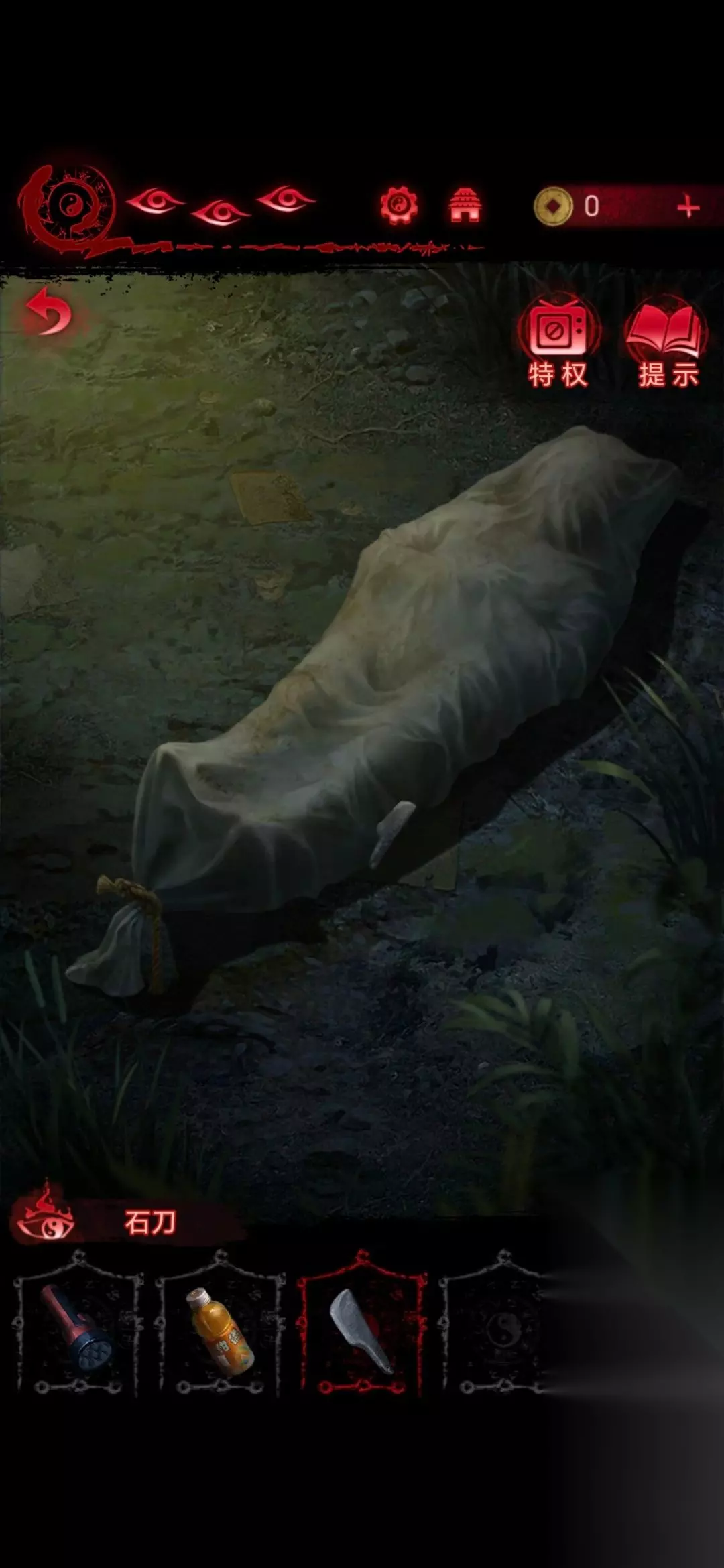 4.返回第一场景,可以用石刀切开右下侧的尸袋,得到纸质寿衣;