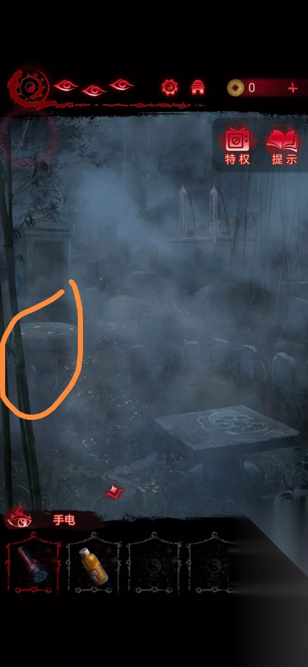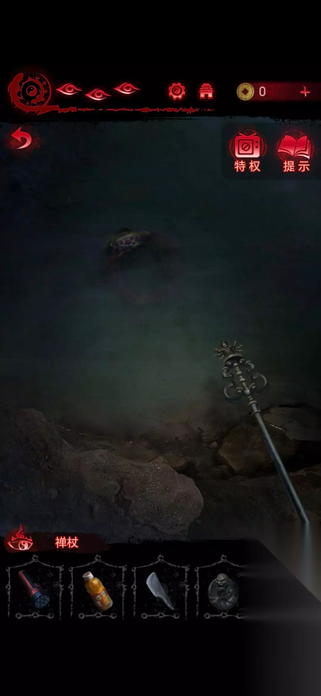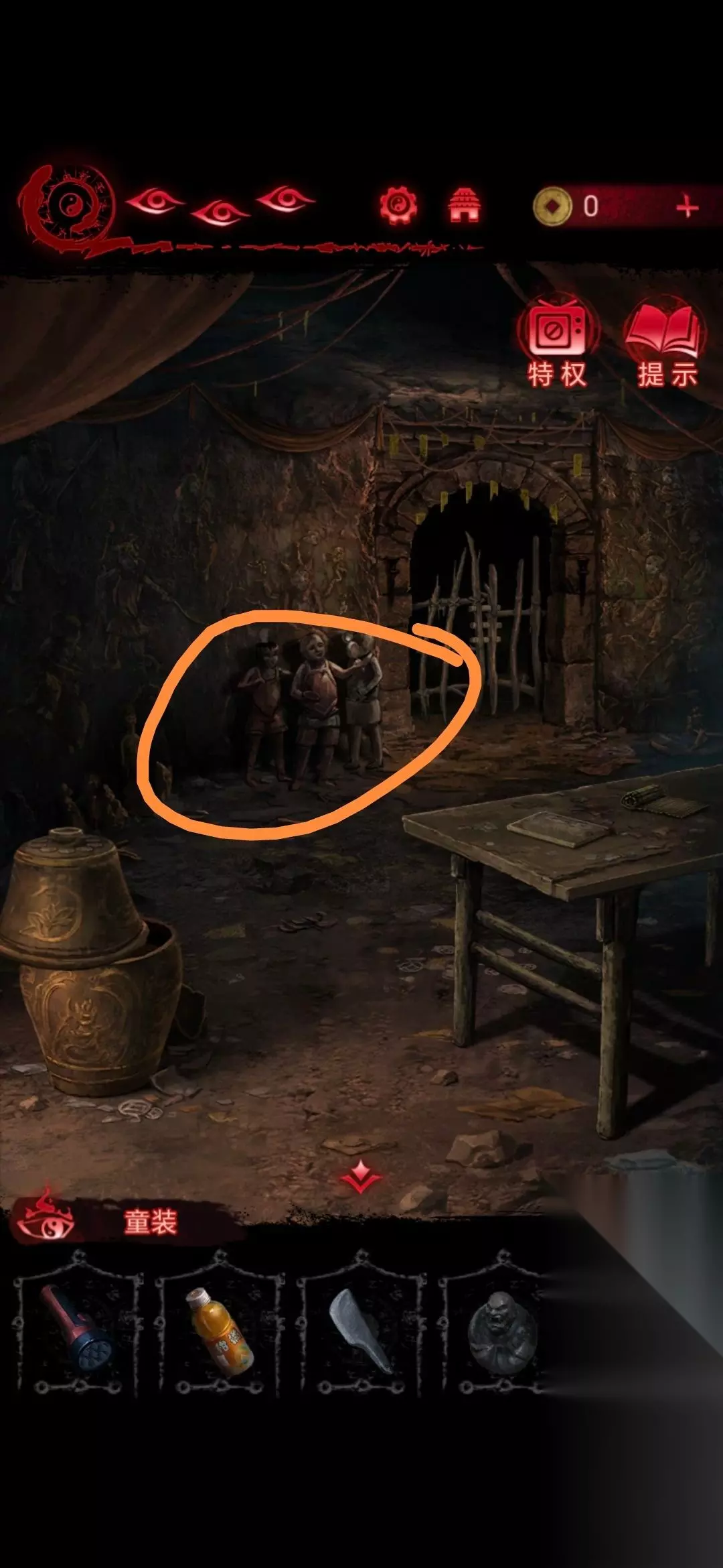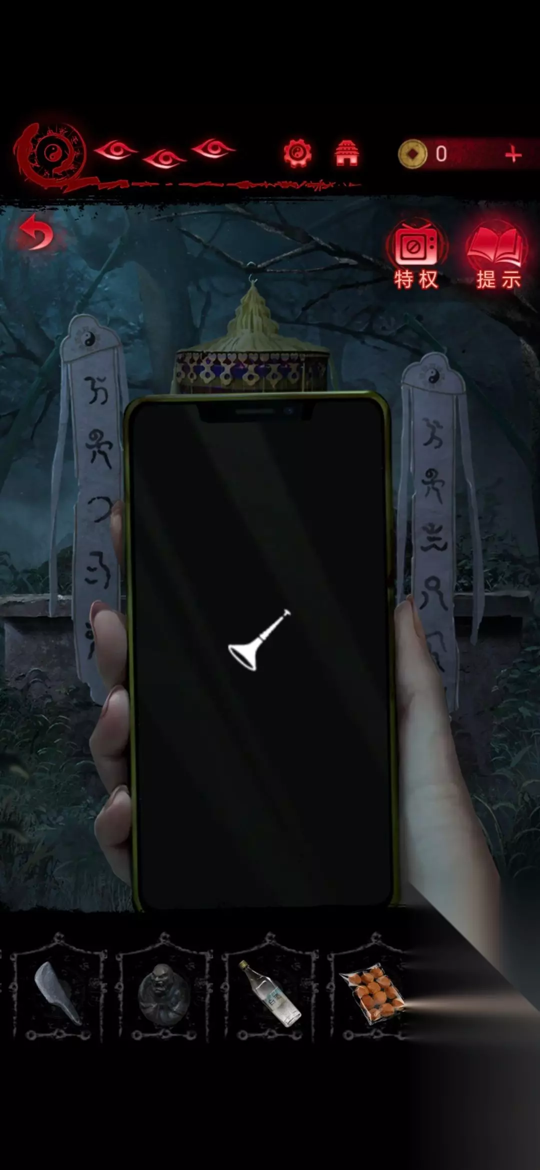 第2章看见邪灵 1、进入第二章后点击左下角书包即可获得手电筒和饮料;