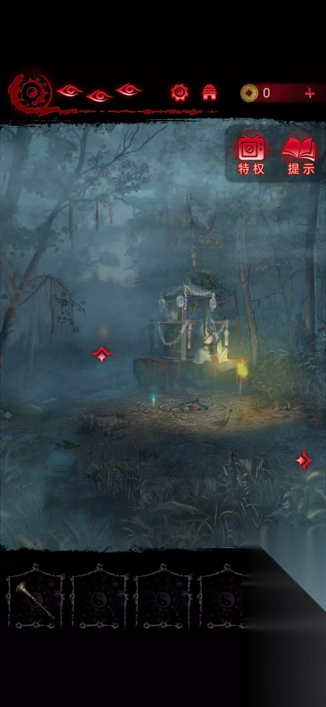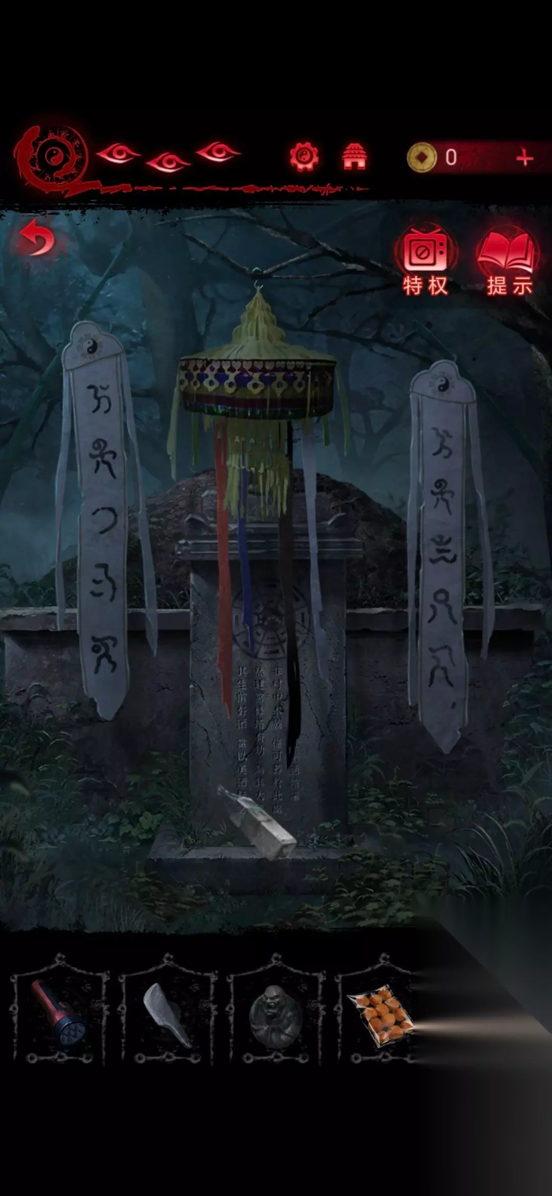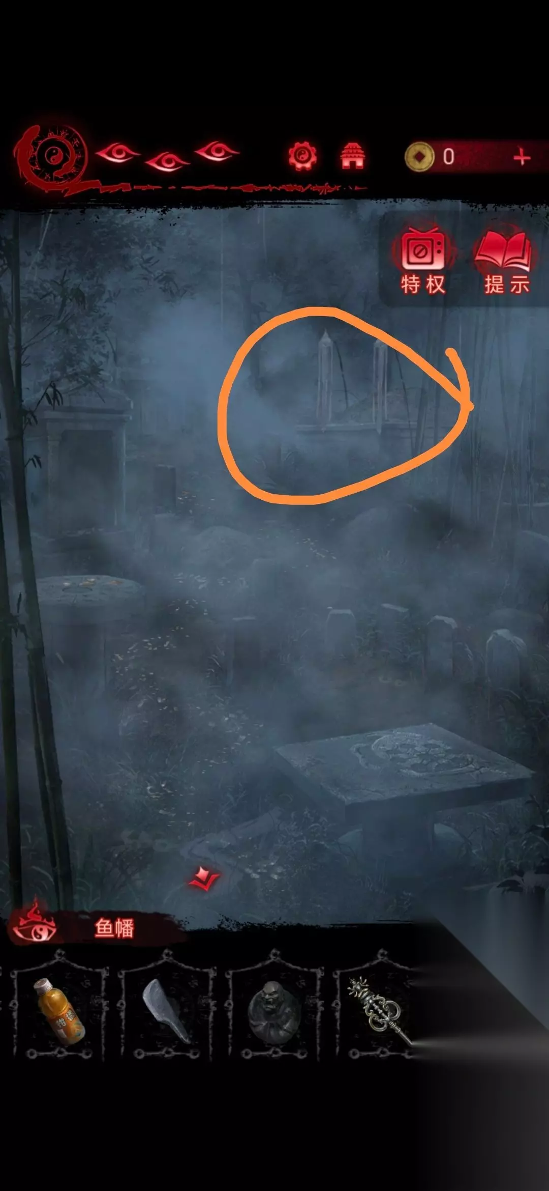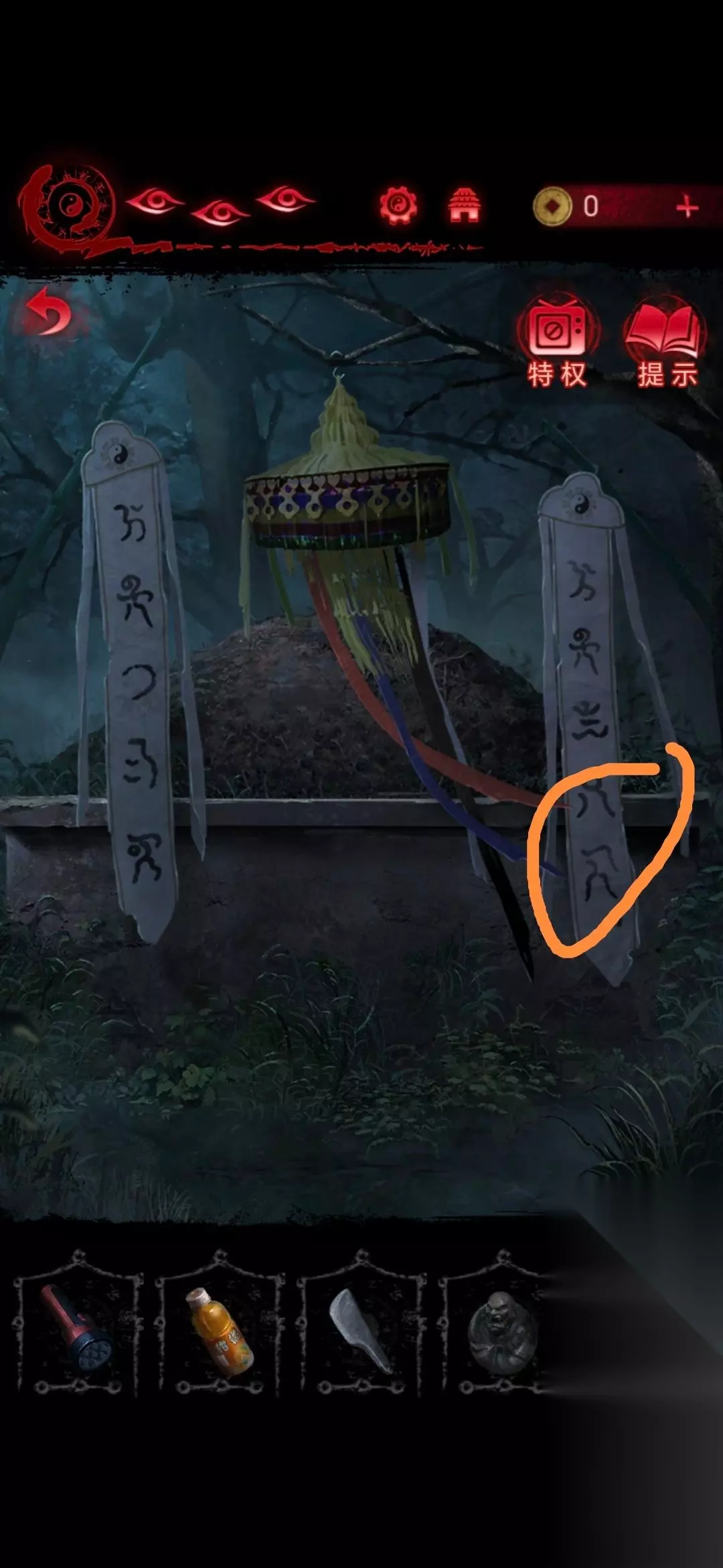 9、再去用禅杖将鱼幡挂在坟头树枝的钩子上,根据风吹过鱼幡后不同颜色指向的符号,就可以解开门的密码,然后进入房间;