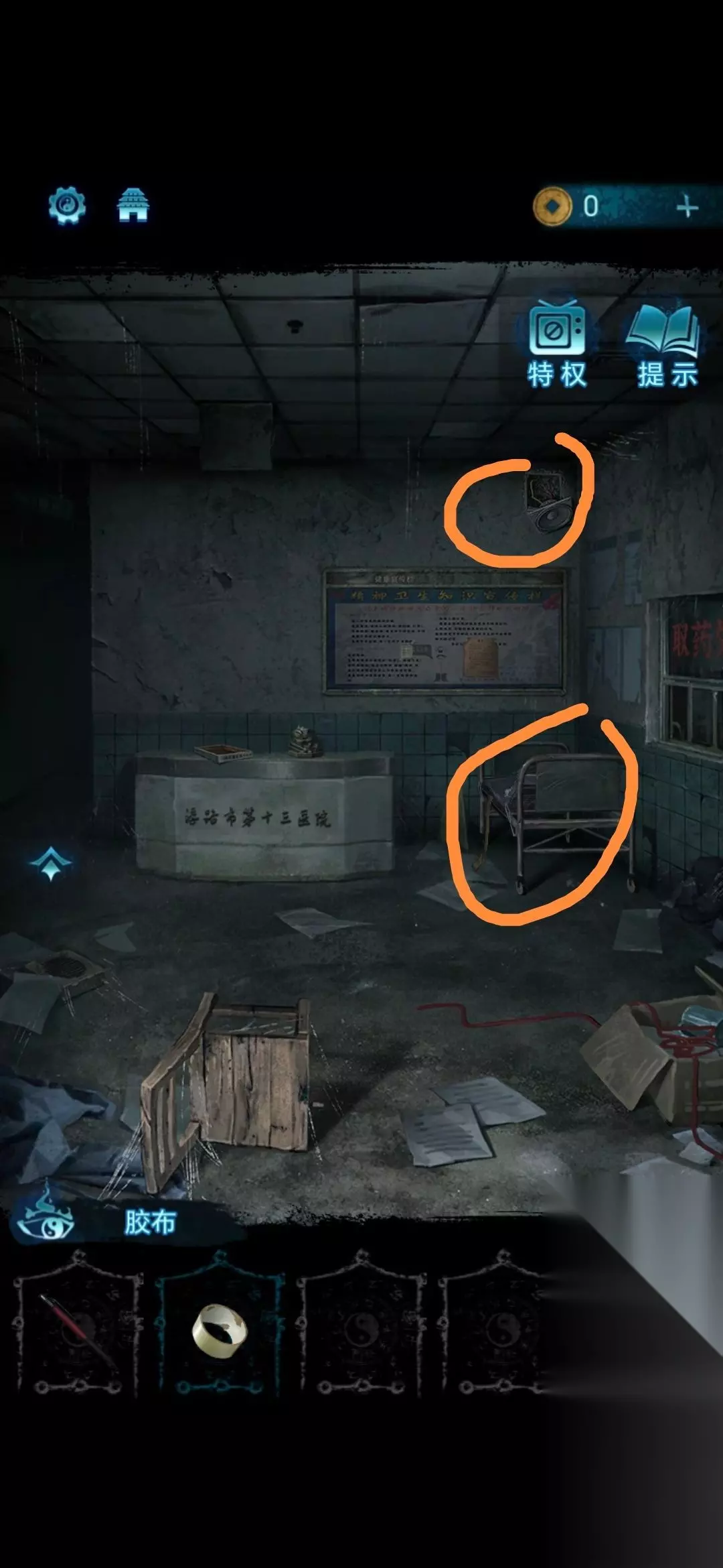3.捡起来后,推大厅右侧的床,点击右上方的扬声器。用胶带将电线粘在此处。粘好后,点击大厅右侧的窗户即可获得药瓶;