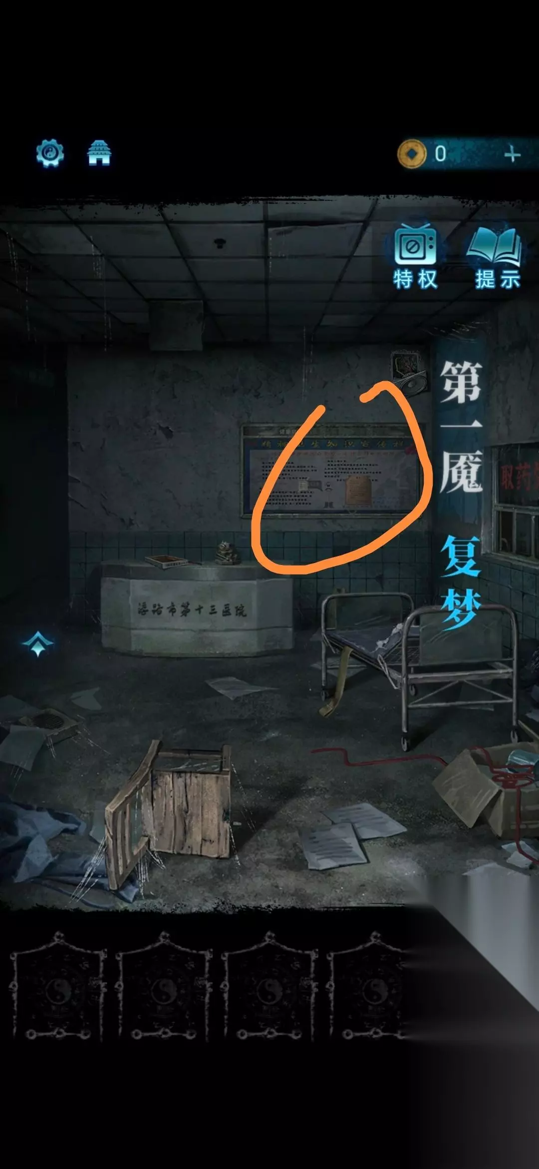 19、点击右侧探视窗口,按照上方镜像文字提示,点击患者眼睛即可获取探视室左下方保险箱密码:左75,右20,左60;