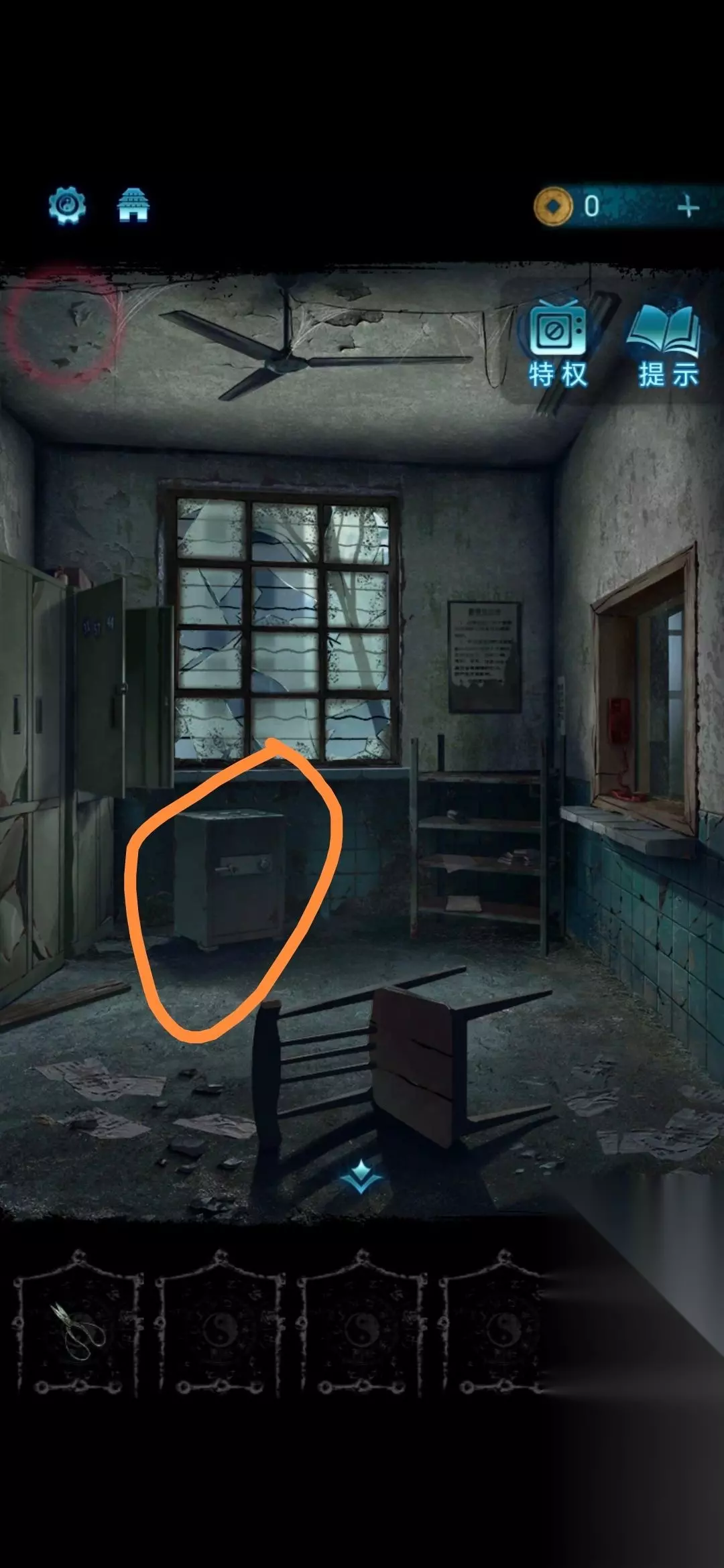 11、进入探视室,先查看线索,按照架子上案例书上的符号,按照左边柜子上的数字顺序排列,解锁柜子上的锁,得到吊扇;
